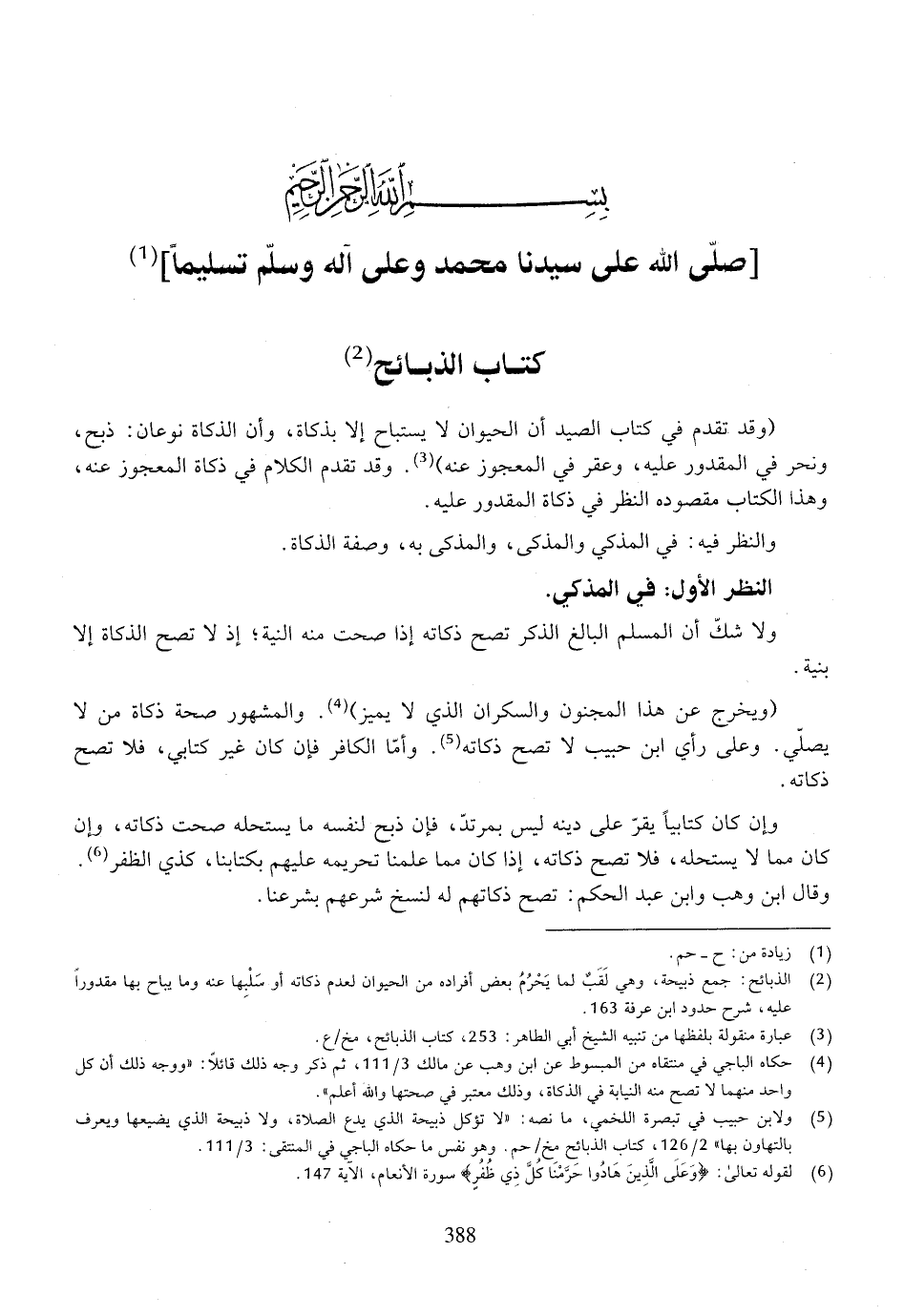 (وقد تقدم في كتاب الصيد أن الحيوان لا يستباح إلا بذكاة، وأن الذكاة نوعان: ذبح، ونحر في المقدور عليه، وعقر في المعجوز عنه). وقد تقدم الكلام في ذكاة المعجوز عنه، وهذا الكتاب مقصوده النظر في ذكاة المقدور عليه.