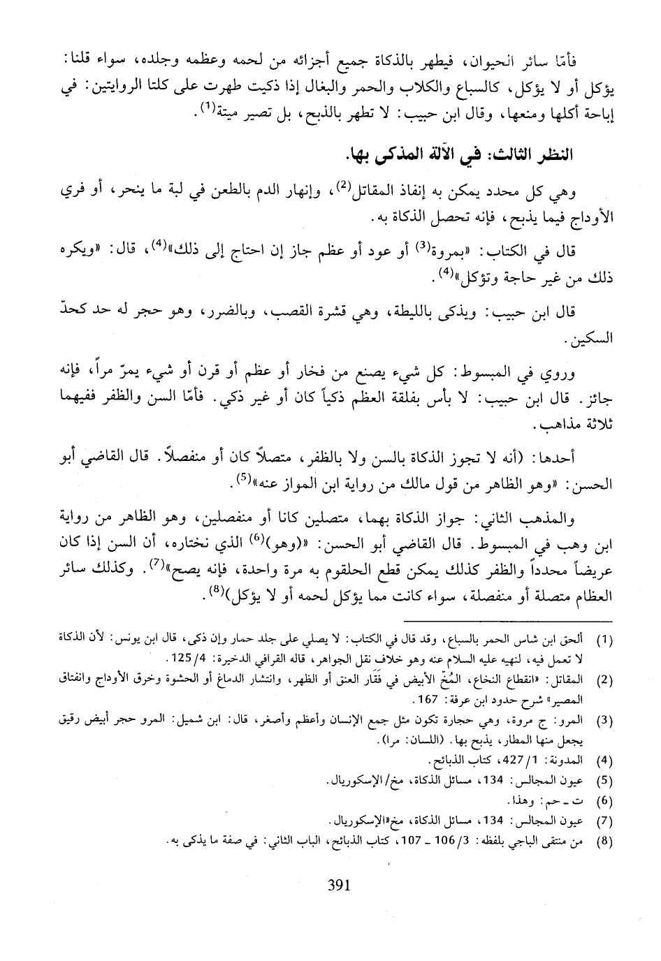 وروي في المبسوط: كل شيء يصنع من فخار أو عظم أو قرن أو شيء يمر مراً، فإنه جائز. قال ابن حبيب: لا بأس بفلقة العظم ذكياً كان أو غير ذكي. فأما السن والظفر ففيهما ثلاثة مذاهب.