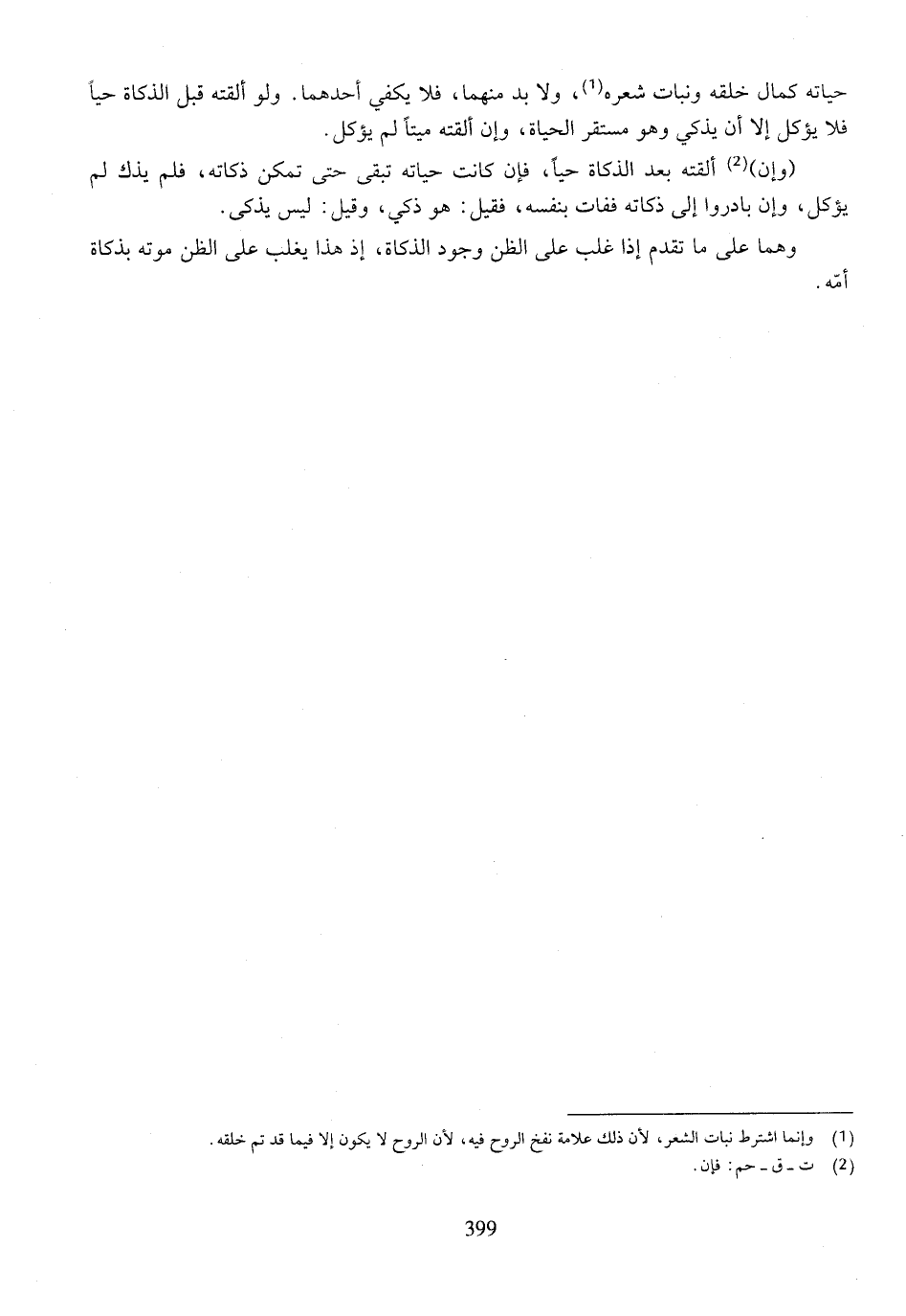 حياته كمال خلقه ونبات شعره، ولابد منهما، فلا يكفي أحدهما. ولو ألقته قبل الذكاة حياً فلا يؤكل إلا أن يذكي وهو مستقر الحياة، وإن ألقته ميتاً لم يؤكل.