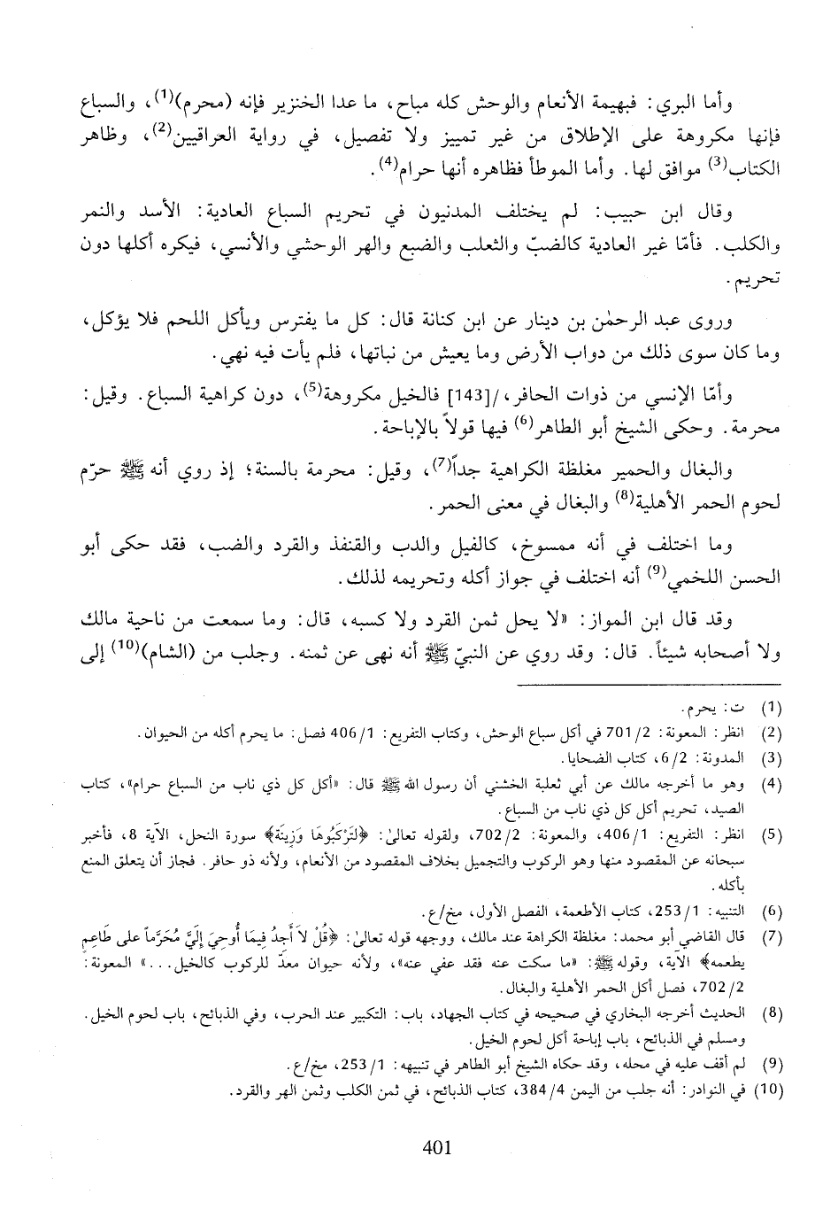 وأما البري: فبهيمة الأنعام والوحش كله مباح، ما عدا الخنزير فإنه (محرم)، والسباع فإنها مكروهة على الإطلاق من غير تمييز ولا تفصيل، في رواية العراقيين، وظاهر الكتاب موافق لها. وأما الموطأ فظاهره أنها حرام.
