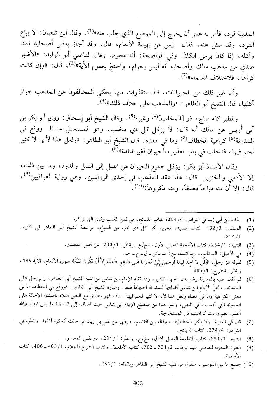 المدينة قرد، فأمر به عمر أن يخرج إلى الموضع الذي جلب منه)). وقال ابن شعبان: لا يباع القرد، وقد سئل عنه، فقال: ليس من بهيمة الأنعام، قال: وقد أجاز بعض أصحابنا ثمنه وأكله، إذا كان يرعى الكلأ. وفي الواضحة: أنه محرم. وقال القاضي أبو الوليد: ((الأظهر عندي من مذهب مالك وأصحابه أنه ليس بحرام، واحتج بعموم الآية))،قال: ((وإن كانت كراهة، فالاختلاف العلماء)).