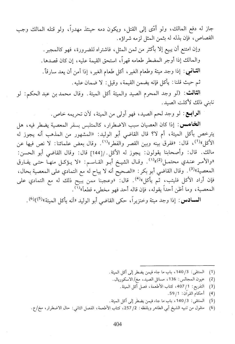 الخامس: إذا كان العصيان سبب الاضطرار، كالمتلبس بسفر المعصية يضطر فيه، هل يترخص بأكل الميتة، أم لا؟ قال القاضي أبو الوليد: ((المشهور من المذهب أنه يجوز له الأكل))، قال: ((ففرق بينه وبين القصر والفطر)). وقال بعض علمائنا: لا نص فيها عن مالك. قال: وأصحابنا يقولون: يجوز له الأكل. قال: وقال القاضي أبو الحسن: ((والأمر عندي محتمل)). وقال الشيخ ابن القاسم: ((لا يؤكل منها حتى يفارق المعصية)). وقال القاضي أبو بكر: ((الصحيح أنه لا يباح له مع التمادي على المعصية بحال، فإن أراد الأكل فليتب، ثم يأكل)). قال: ((وعجبنا ممن يبيح ذلك له مع التمادي على المعصية، وما أظن أحداً يقوله، فإن قاله أحد فهو مخطئ قطعاً)).