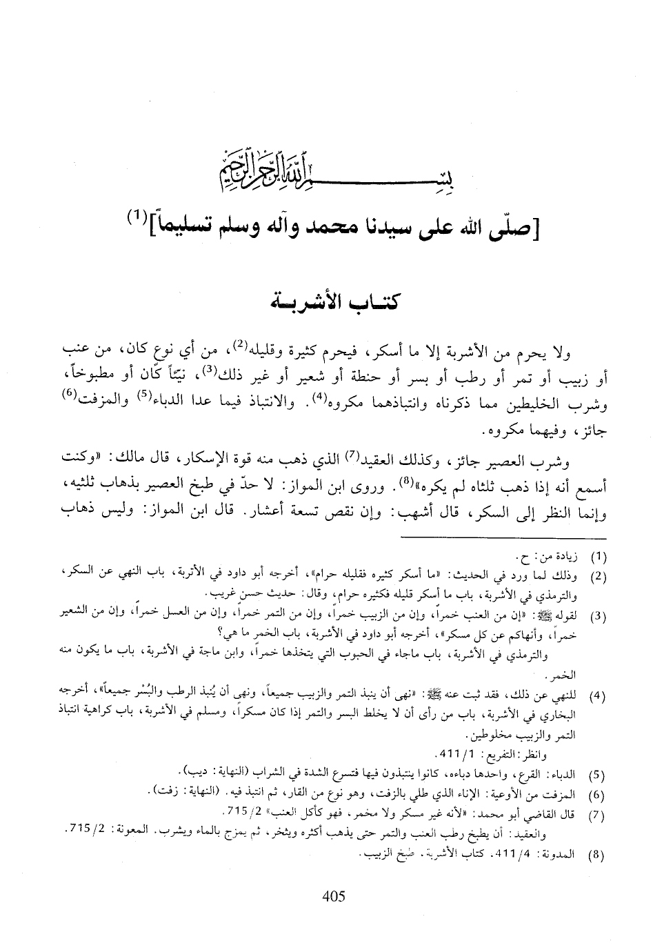 ولا يحرم من الأشربة إلا ما أسكر، فيحرم كثيره وقليله، من أي نوع كان، من عنب أو زبيب أو تمر أو رطب أو بسر أو حنطة أو شعير أو غير ذلك، نيأ كان أو مطبوخاً، وشرب الخليطين مما ذكرناه وانتباذهما مكروه. والانتباذ فيما عدا الدباء والمزفت جائز، وفيهما مكروه.