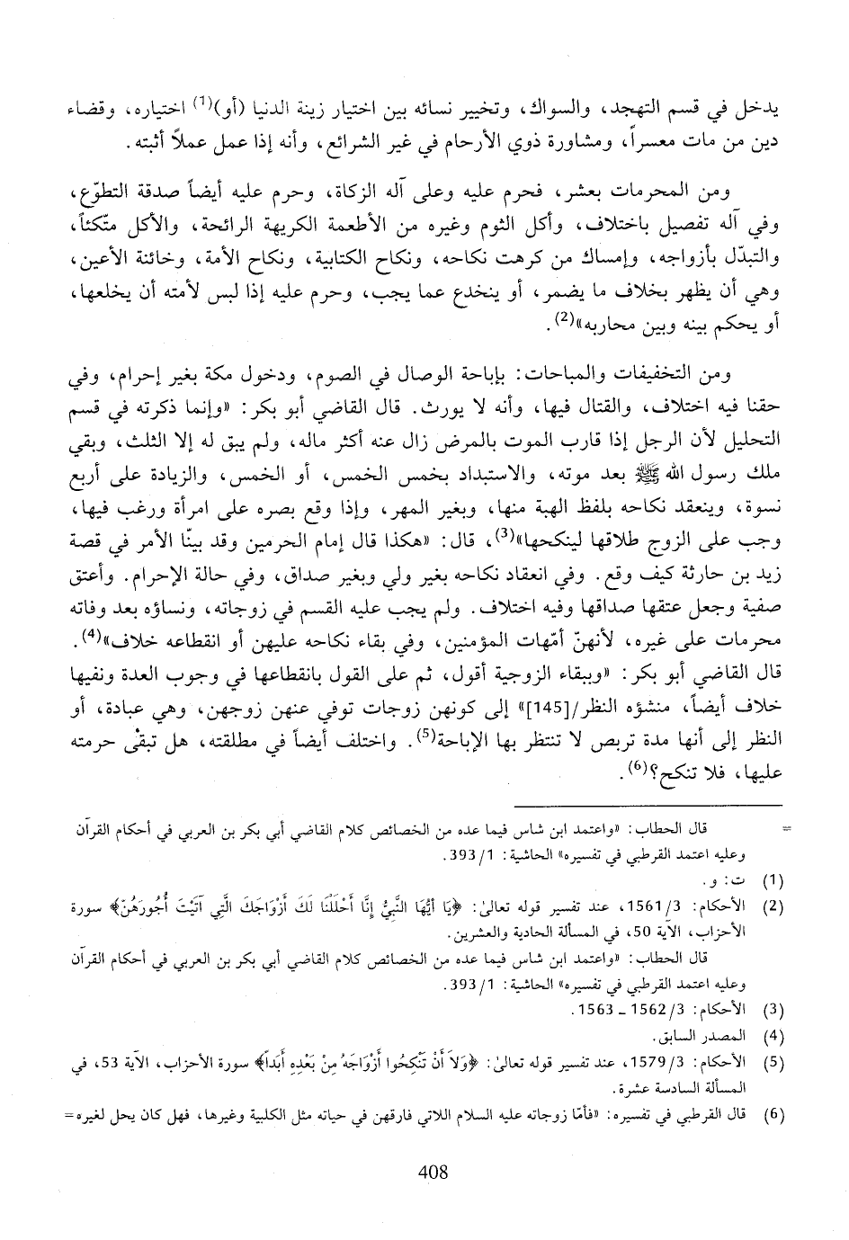 ومن التخفيفات والمباحات: بإباحة الوصال في الصوم، ودخول مكة بغير إحرام، وفي حقنا فيه اختلاف، والقتال فيها، وأنه لا يورث. قال القاضي أبو بكر: ((وإنما ذكرته في قسم التحليل لأن الرجل إذا قارب الموت بالمرض زال عنه أكثر ماله، ولم يبق له إلا الثلث، وبقي ملك رسول الله صلى الله عليه وسلم بعد موته، والاستبداد بخمس الخمس، أو الخمس، والزيادة على أربع نسوة، وينعقد نكاحه بلفظ الهبة منها، وبغير المهر، وإذا وقع بصره على امرأة ورغب فيها، وجب على الزوج طلاقها لينكحها))، قال: ((هكذا قال إمام الحرمين وقد بينا الأمر في قصة زيد بن حارثة كيف وقع. وفي انعقاد نكاحه بغير ولي وبغير صداق، وفي حالة الإحرام. وأعتق صفية وجعل عتقها صداقها وفيه اختلاف. ولم يجب عليه القسم في زوجاته، ونساؤه بعد وفاته محرمات على غيره، لأنهن أمهات المؤمنين، وفي بقاء نكاحه عليهن أو انقطاعه خلاف)).