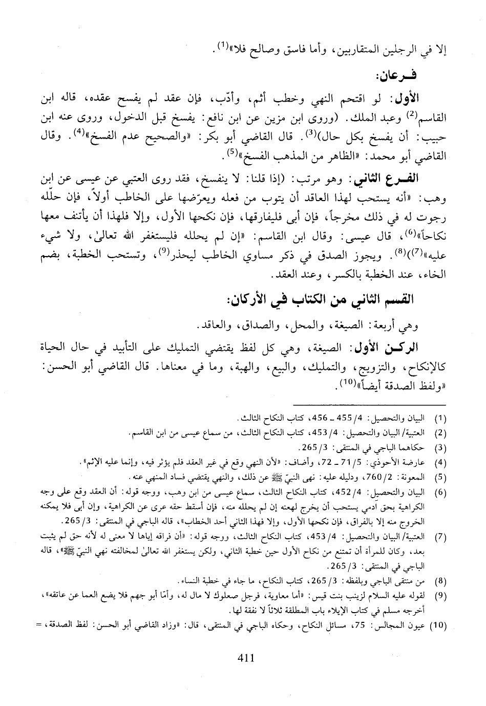 الفرع الثاني: وهو مرتب: (إذا قلنا: لا ينفسخ، فقد روى العتبي عن عيسى عن ابن وهب: ((أنه يستحب لهذا العاقد أن يتوب من فعله ويعرضها على الخاطب أولاً، فإن حلله رجوت له في ذلك مخرجاً، فإن أبى فليفارقها، فإن نكحها الأول، وإلا فلهذا أن يأتنف معها نكاحاً))، قال عيسى: وقال ابن القاسم: ((إن لم يحلله فليستغفر الله تعالى، ولا شيء عليه)). ويجوز الصدق في ذكر مساوي الخاطب ليحذر، وتستحب الخطبة، بضم الخاء، عند الخطبة بالكسر، وعند العقد.