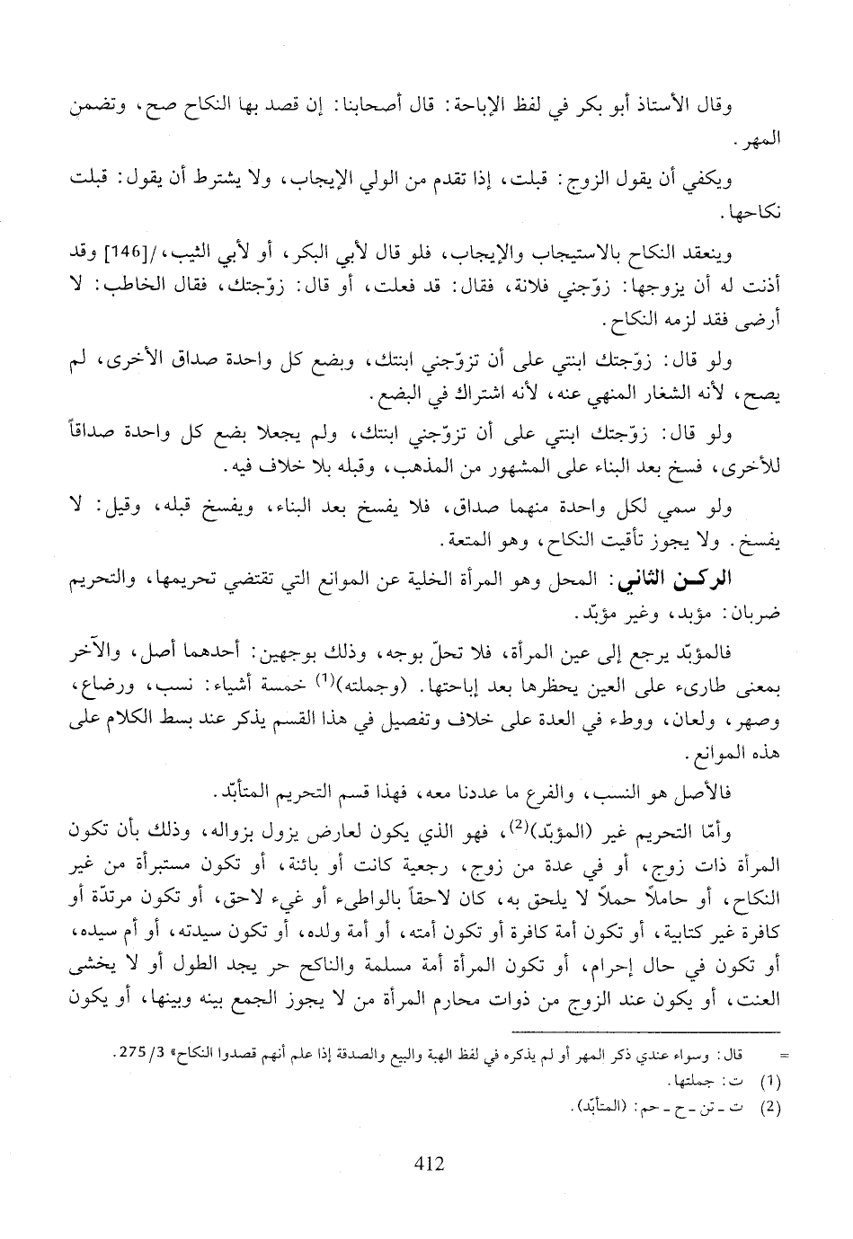 فالمؤبد يرجع إلى عين المرأة، فلا تحل بوجه، وذلك بوجهين: أحدهما أصل، والآخر بمعنى طارئ على العين يحظرها بعد إباحتها. (وجملته) خمسة أشياء: نسب، ورضاع، وصهر، ولعان، ووطء في العدة على خلاف وتفصيل في هذا القسم يذكر عند بسط الكلام على هذه الموانع.