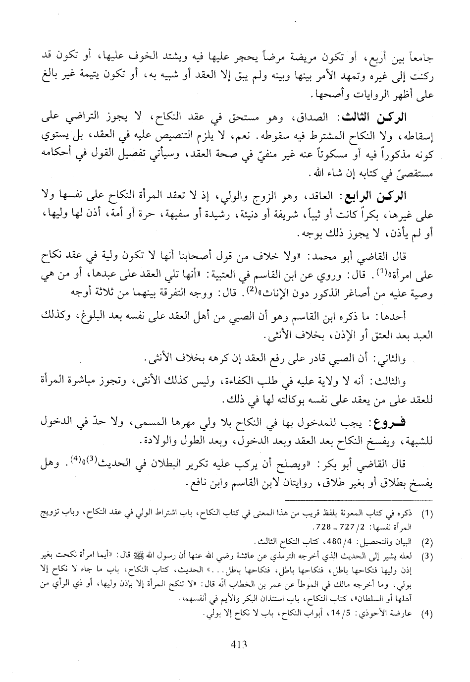 الركن الرابع: العاقد، وهو الزوج والولي، إذ لا تعقد المرأة النكاح على نفسها ولا على غيرها، بكراً كانت أو ثيباً، شريفة أو دنيئة، رشيدة أو سفيهة، حرة أو أمة، أذن لها وليها، أو لم يأذن، لا يجوز ذلك بوجه.