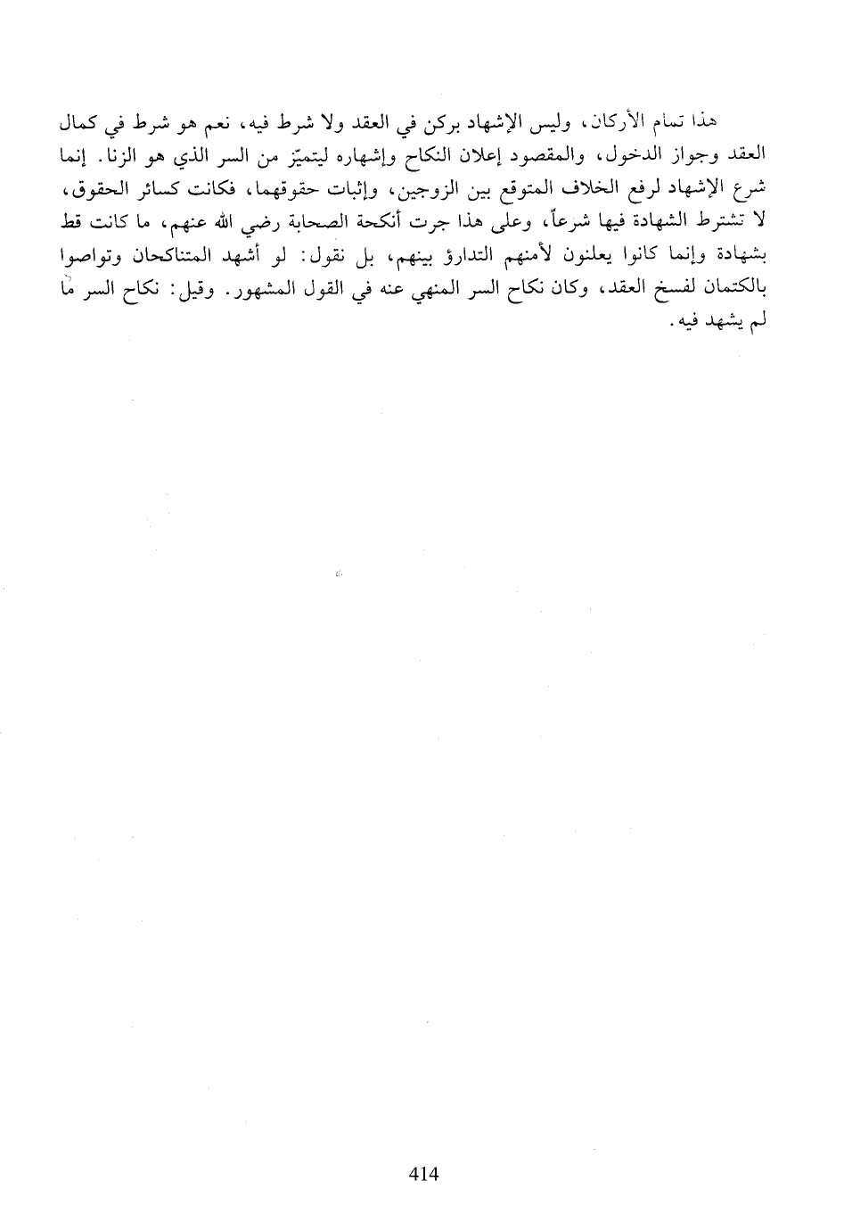 هذا تمام الأركان، وليس الإشهاد بركن في العقد ولا شرط فيه، نعم هو شرط في كمال العقد وجواز الدخول، والمقصود إعلان النكاح وإشهاره ليتميز من السر الذي هو الزنا. وإنما شرع الإشهاد لرفع الخلاف المتوقع بين الزوجين، وإثبات حقوقهما، فكانت كسائر الحقوق، لا تشترط الشهادة فيها شرعاً، وعلى هذا جرت أنكحة الصحابة رضي الله عنهم، ما كانت قط بشهادة وإنما كانوا يعلنون لأمنهم التدارؤ بينهم،، بل تقول: لو أشهد المتناكحان وتواصوا بالكتمان لفسخ العقد، وكان نكاح السر المنهي عنه في القول المشهور. وقيل: نكاح السر ما لم يشهد فيه.