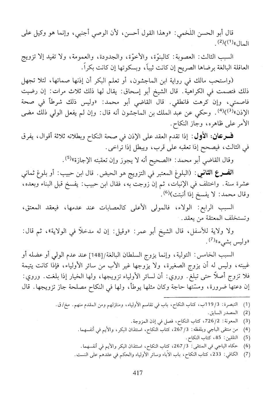 الفرع الثاني: (البلوغ المعتبر في التزويج هو الحيض. قال ابن حبيب: أو بلوغ ثماني عشرة سنة. واختلف في الإنبات، ثم إن زوجت به، فقال ابن حبيب: يفسخ قبل البناء وبعده، وقال محمد: لا يفسخ إذا أنبتت).