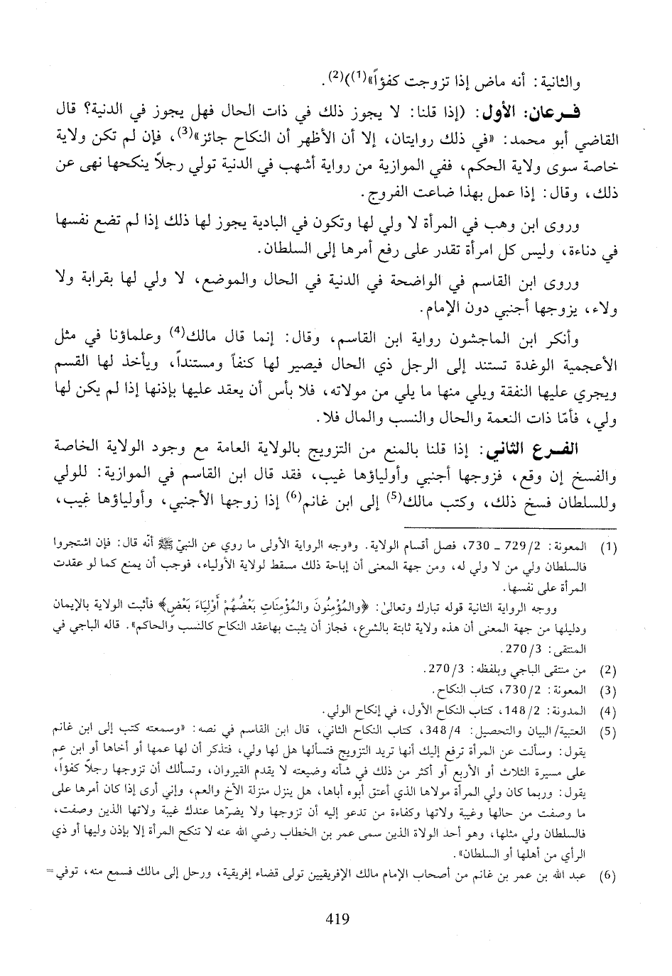 الفرع الثاني: إذا قلنا بالمنع من التزويج بالولاية العامة مع وجود الولاية الخاصة والفسخ إن وقع، فزوجها أجنبي وأولياؤها غيب، فقد قال ابن القاسم في الموازية: للولي وللسلطان فسخ ذلك، وكتب مالك إلى ابن غانم إذا زوجها الأجنبي، وأولياؤها غيب،