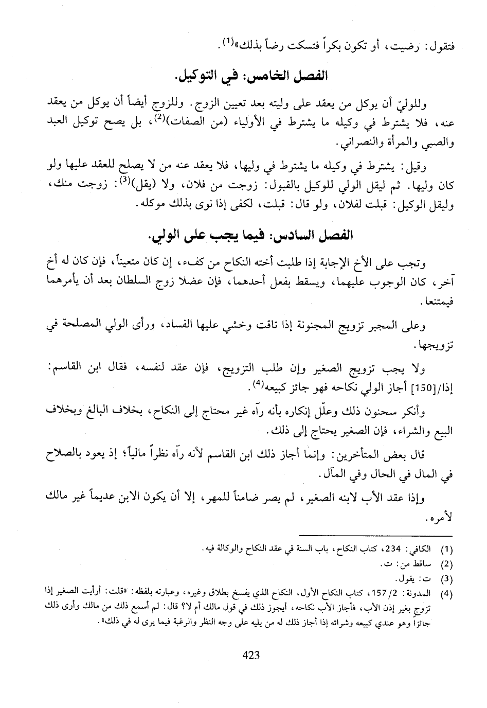 وأنكر سحنون ذلك وعلل إنكاره بأنه رآه غير محتاج إلى النكاح، بخلاف البالغ وبخلاف البيع والشراء، فإن الصغير يحتاج إلى ذلك.
