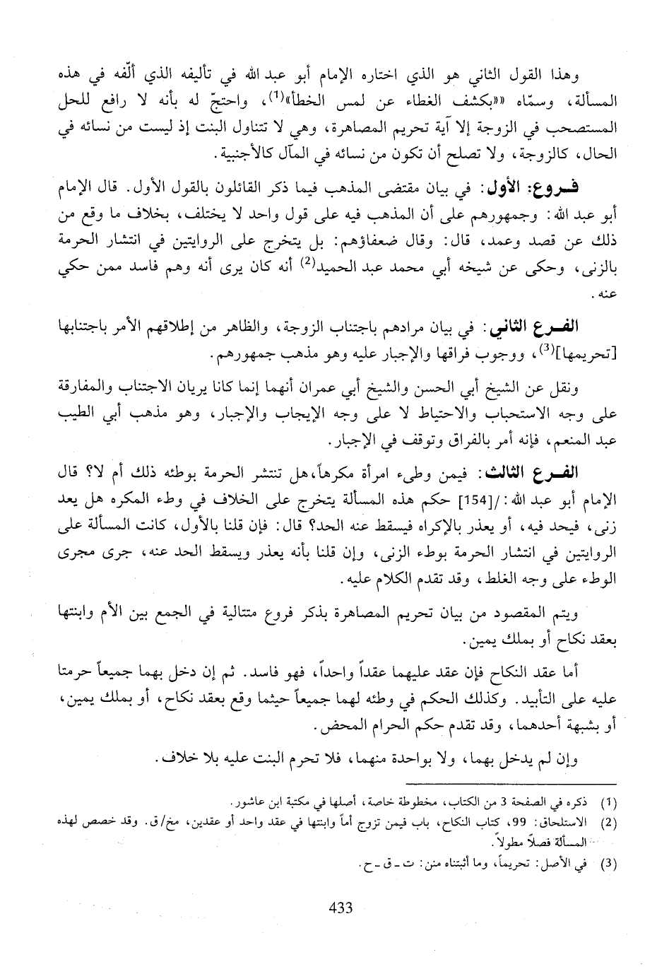 وهذا القول الثاني هو الذي اختاره الإمام أبو عبد الله في تأليفه الذي ألفه في هذه المسألة، وسماه ((بكشف الغطاء عن لمس الخطأ))، واحتج له بأنه لا رافع للحل المستصحب في الزوجة إلا آية تحريم المصاهرة، وهي لا تتناول البنت إذ ليست من نسائه في الحال، كالزوجة، ولا تصلح أن تكون من نسائه في المآل كالأجنبية.