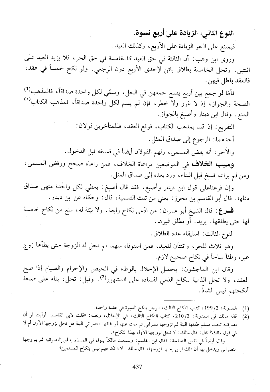 وروى ابن وهب: أن الثالثة في حق العبد كالخامسة في حق الحر، فلا يزيد العبد على اثنتين. وتحل الخامسة بطلاق بائن لإحدى الأربع دون الرجعي. ولو نكح خمساً في عقد، فالعقد باطل فيهن.