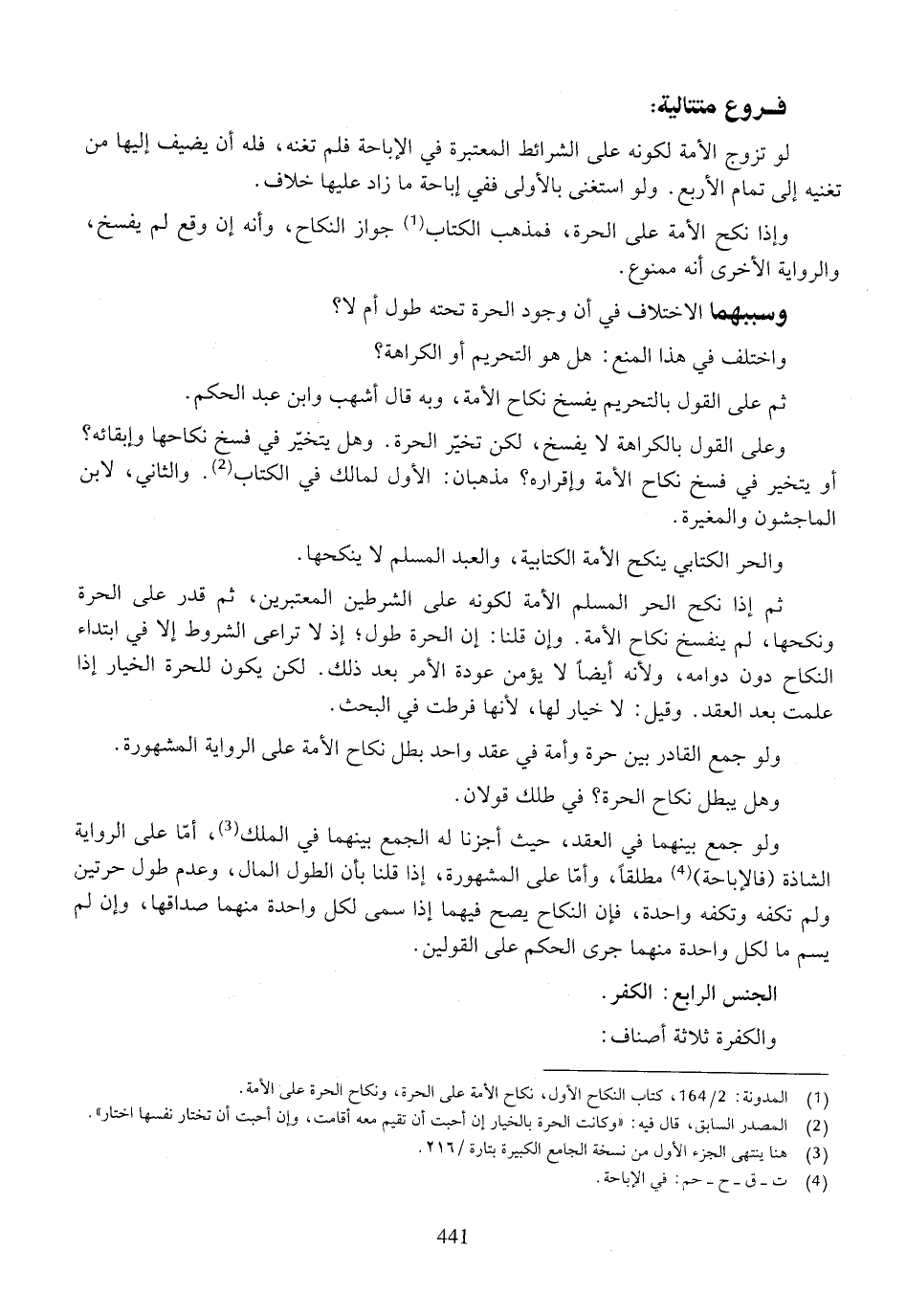 وإذا نكح الأمة على الحرة، فمذهب الكتاب جواز النكاح، وأنه إن وقع لم يفسخ، والرواية الأخرى أنه ممنوع.