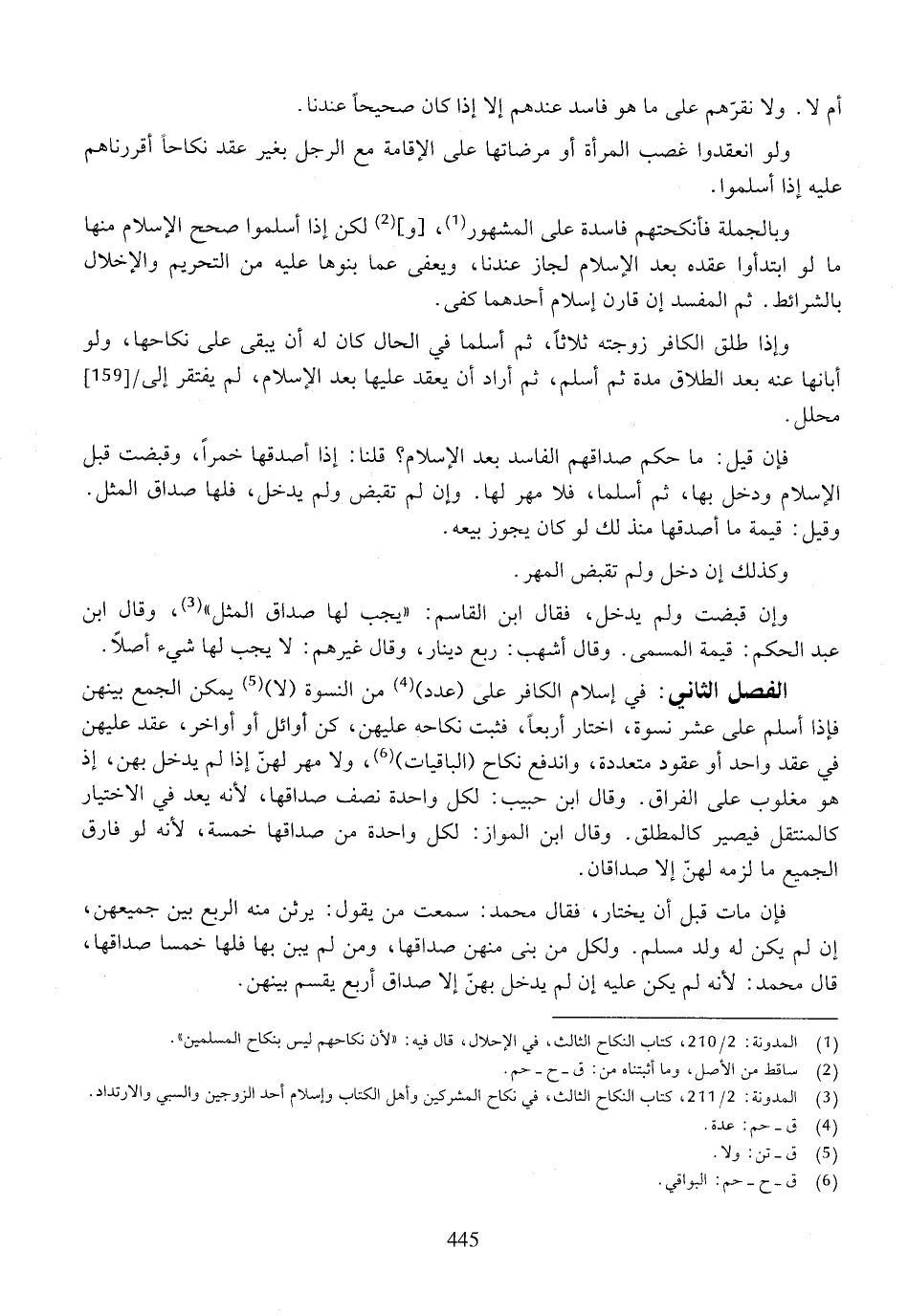الفصل الثاني: في إسلام الكافر على (عدد) من النسوة (لا) يمكن الجمع بينهن فإذا أسلم على عشر نسوة، اختار أربعاً، فثبت نكاحه عليهن، كن أوائل أو أواخر، عقد عليهن في عقد واحد أو عقود متعددة، واندفع نكاح (الباقيات)، ولا مهر لهن إذا لم يدخل بهن، إذ هو مغلوب على الفراق. وقال ابن حبيب: لكل واحدة نصف صداقها، لأنه يعد في الاختيار كالمنتقل فيصير كالمطلق. وقال ابن المواز: لكل واحدة من صداقها خمسة، لأنه لو فارق الجميع ما لزمه لهن إلا صداقان.