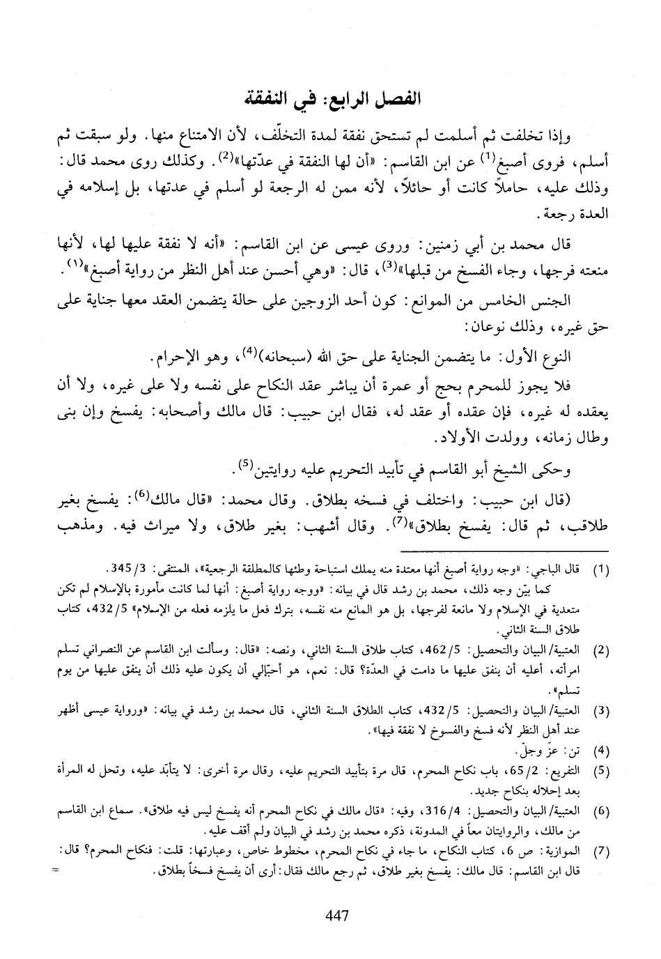 وإذا تخلفت ثم أسلمت لم تستحق نفقة لمدة التخلف، لأن الامتناع منها. ولو سبقت ثم أسلم، فروى أصبغ عن ابن القاسم: ((أن لها النفقة في عدتها)). وكذلك روى محمد قال: وذلك عليه، حاملاً كانت أو حائلاً، لأنه ممن له الرجعة لو أسلم في عدتها، بل إسلامه في العدة رجعة.