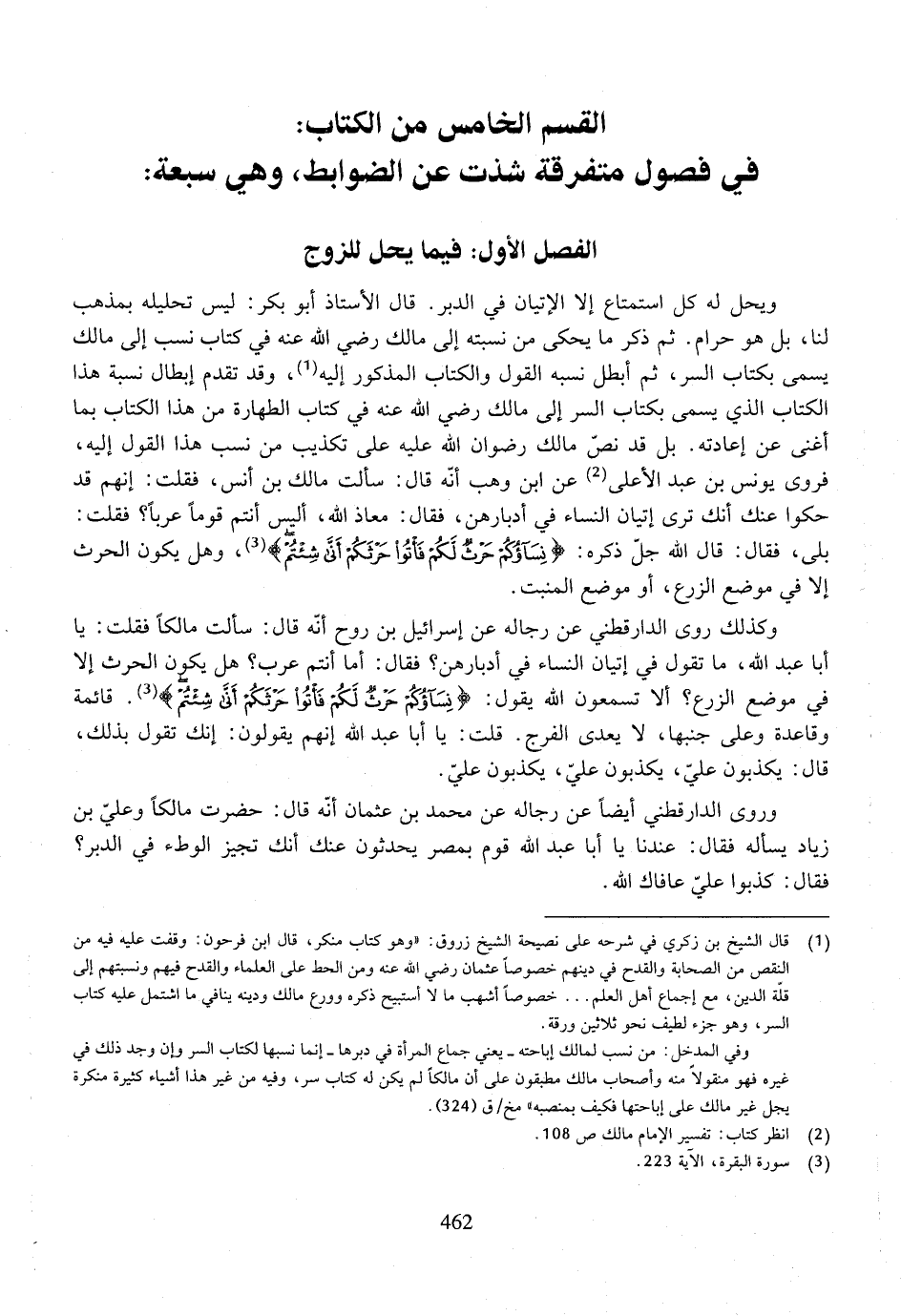 وكذلك روى الدارقطني عن رجاله عن إسرائيل بن روح أنه قال: سألت مالكاً فقلت: يا أبا عبد الله، ما تقول في إتيان النساء في أدبارهن؟ فقال: أما أنتم عرب؟ هل يكون الحرث إلا في موضع الزرع؟ ألا تسمعون الله يقول: {نساؤكم حرث لكم فأتوا حرثكم إنى شئتم}. قائمة وقاعدة على جنبها، لا يعدى الفرج. قلت: يا أبا عبد الله إنهم يقولون: إنك تقول بذلك، قال: يكذبون علي، يكذبون علي، يكذبون علي.