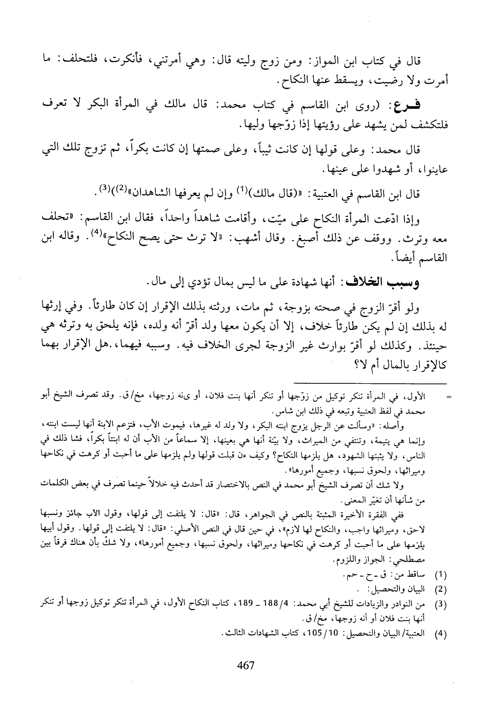 وإذا ادعت المرأة النكاح على ميت، وأقامت شاهداً واحداً، فقال ابن القاسم: ((تحلف معه وترث. ووقف عن ذلك أصبغ. وقال أشهب: ((لا ترث حتى يصح النكاح)). وقاله ابن القاسم أيضاً.