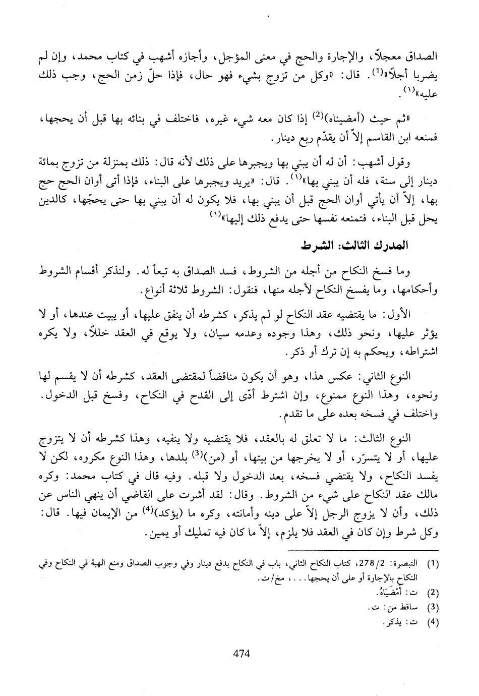 النوع الثالث: ما لا تعلق له بالعقد، فلا يقتضيه ولا ينفيه، وهذا كشرطه أن لا يتزوج عليها، أو لا يتسرر، أو لا يخرجها من بيتها، أو (من) بلدها، وهذا النوع مكروه، لكن لا يفسد النكاح، ولا يقتضي فسخه، بعد الدخول ولا قبله. وفيه قال في كتاب محمد: وكره مالك عقد النكاح على شيء من الشروط. وقال: لقد أشرت على القاضي أن ينهي الناس عن ذلك، وأن لا يزوج الرجل إلا على دينه وأمانته، وكره ما (يؤكد) من الإيمان فيها. قال: وكل شرط وإن كان في العقد فلا يلزم، إلا ما كان فيه تمليك أو يمين.