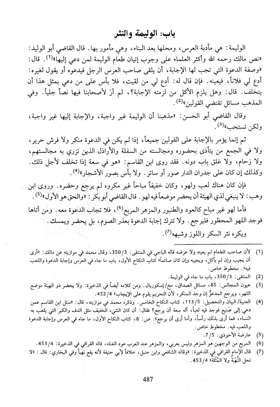 الوليمة: هي مأدبة العرس، ومحلها بعد البناء، وهي مأمور بها. قال القاضي أبو الوليد: ((نص مالك رحمه الله وأكثر العلماء على وجوب إتيان طعام الوليمة لمن دعي إليها)). قال: ((وصفة الدعوة التي تجب لها الإجابة، أن يلقى صاحب العرس الرجل فيدعوه أو يقول لغيره: أدع لي فلاناً، فيعينه. فإن قال له: ادع لي من لقيت، فلا بأس على من دعي بمثل هذا أن يتخلف. قال: وهل يلزم الأكل من لزمته الإجابة؟، لم أر لأصحابنا فيها نصاً جلياً. وفي المذهب مسائل تقتضي القولين)).