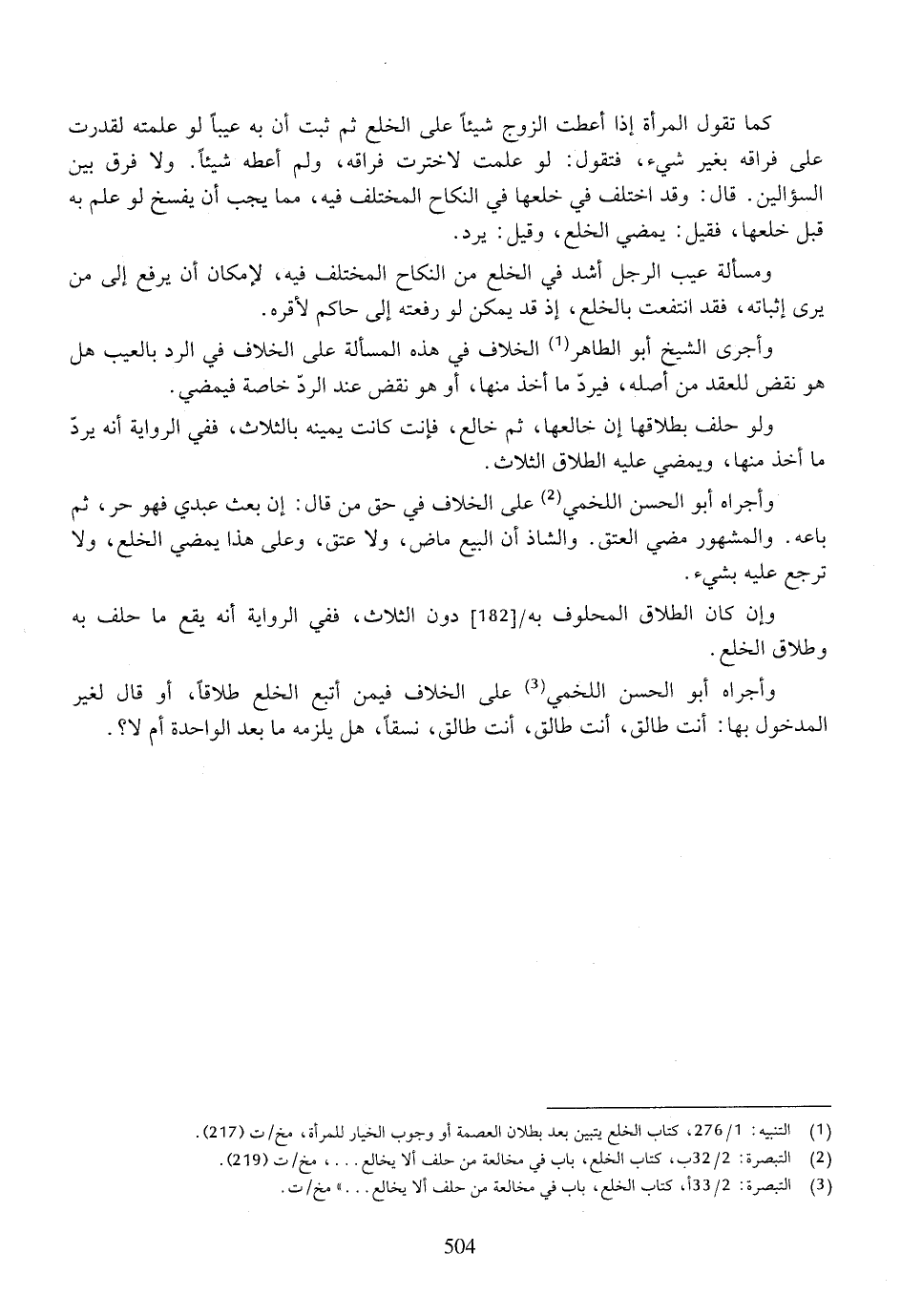 كما تقول المرأة إذا أعطت الزوج شيئاً على الخملع ثم ثبت أن به عيباً لو علمته لقدرت على فراقه بغير شيء، فتقول: لو علمت لاخترت فراقه، ولم أعطه شيئاً. ولا فرق بين السؤالين. قال: وقد اختلف في خلعها في النكاح المختلف فيه، مما يجب أن يفسخ لو علم به قبل خلعها، فقيل: يمضي الخلع، وقيل: يرد.