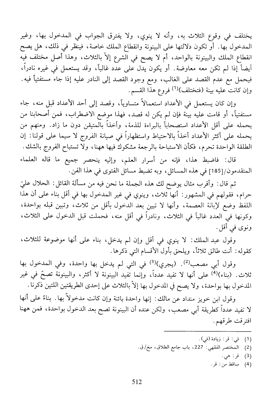 يختلف في وقوع الثلاث به، وأنه لا ينوي، ولا يفترق الجواب في المدخول بها، وغير المدخول بها. أو تكون دلالتها على البينونة وانقطاع الملك خاصة، فينظر في ذلك، هل يصح انقطاع الملك والبينونة بالواحد، أم لا يصح في الشرع إلا بالثلاث، وهذا أصل مختلف فيه أيضاً إذا لم تكن معه معاوضة. أو يكون يدل على عدد غالباً، وقد يستعمل في غره نادراً، فيحمل مع عدم القصد على الغالب، ومع وجود القصد إلى النادر عليه إذا جاء مستفتياً فيه.
