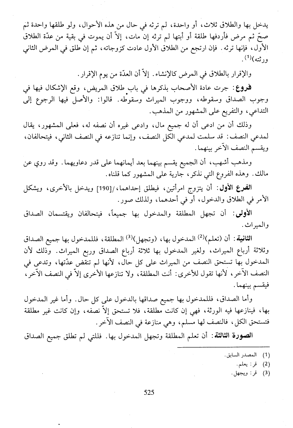 الثانية: أن (تعلم) المدخول بها، (وتجهل) المطلقة، فللمدخول بها جميع الصداق وثلاثة أرباع الميراث، ولغير المدخول بها ثلاثة أرباع الصداق وربع الميراث. وذلك لأن المدخول بها تستحق النصف من الميراث على كل حال، لأنها لم تنقض عدتها، وتدعي في النصف الآخر، لأنها تقول للأخرى: أنت المطلقة، ولا تنازعها الأخرى إلا في النصف الآخر، فيقسم بينهما.