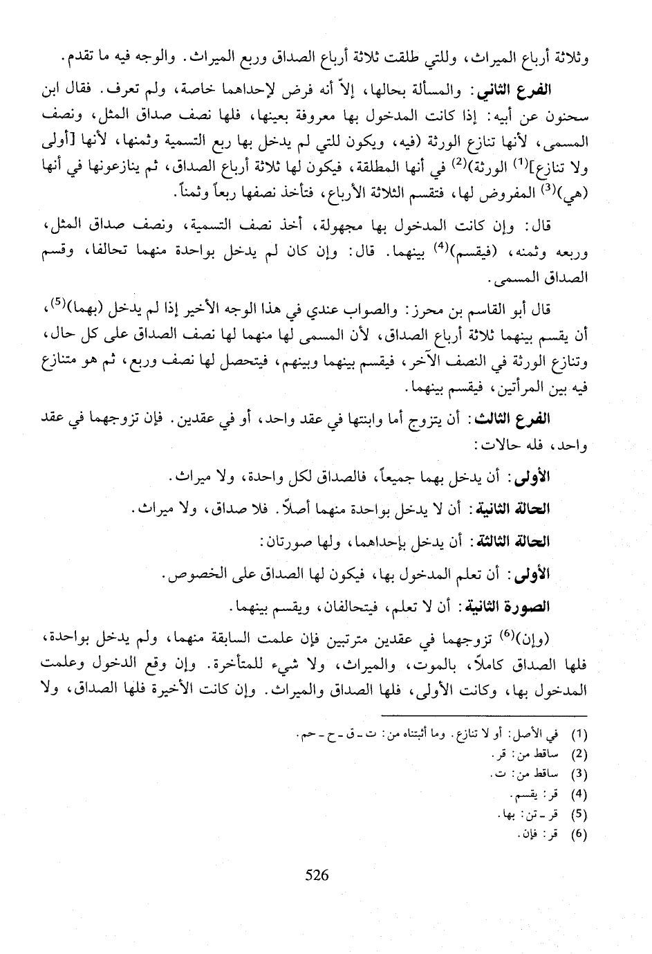 الفرع الثاني: والمسألة بحالها، إلا أنه فرض لإحداهما خاصة، ولم تعرف. فقال ابن سحنون عن أبيه: إذا كانت المدخول بها معروفة بعينها، فلها نصف صداق المثل، ونصف المسمى، لأنها تنازع الورثة (فيه، ويكون للتي لم يدخل بها ربع التسمية وثمنها، لأنها [أولى ولا تنازع] الورثة) في أنها المطلقة، فيكون لها ثلاثة أرباع الصداق، ثم ينازعونها في أنها (هي) المفروض لها، فتقسم الثلاثة الأرباع، فتأخذ نصفها ربعاً وثمناً.
