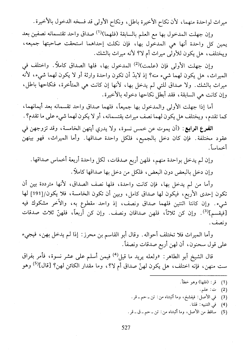 الفرع الرابع: (أن يموت عن خمس نسوة، ولا يدري أيتهن الخامسة، وقد تزوجهن في عقود مختلفة. فإن كان دخل بالجميع، فلكل واحدة صداقها. وأما الميراث، فهو بينهن أخماساً.