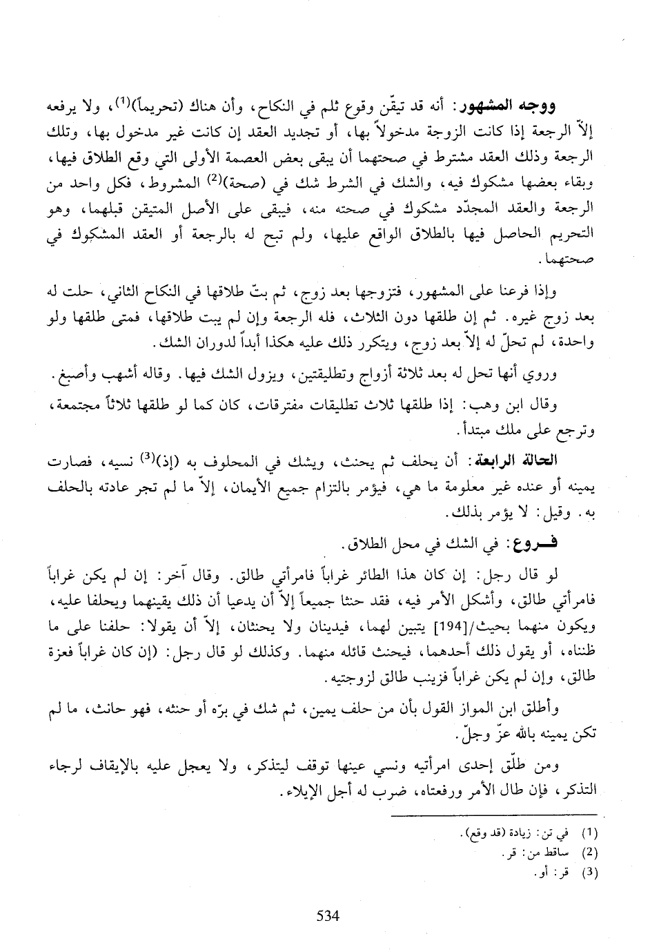 ووجه المشهور: أنه قد تيقن وقوع ثلم في النكاح، وأن هناك (تحريماً)، ولا يرفعه إلا الرجعة إذا كانت الزوجة مدخولاً بها، أو تجديد العقد إن كانت غير مدخول بها، وتلك الرجعة وذلك العقد مشترك في صحتهما أن يبقى بعض العصمة الأولى التي وقع الطلاق فيها، وبقاء بعضها مشكوك فيه، والشك في الشرط شك في (صحة) المشروط، فكل واحد من الرجعة والعقد المجدد مشكوك في صحته منه، فيبقى على الأصل المتيقن قبلهما، وهو التحريم والحاصل فيها بالطلاق الواقع عليها، ولم تبح له بالرجعة أو العقد المشوك في صحتهما.