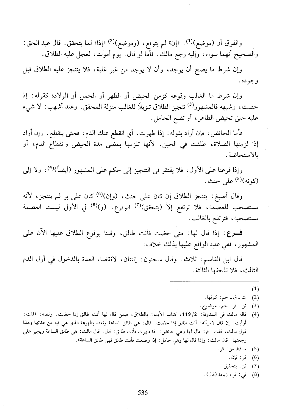 وإن شرط ما الغالب وقوعه كزمن الحيض أو الطهر أو الحمل أو الولادة كقوله: إذ حضت، وشبهه فالمشهور تنجيز الطلاق تنزيلاً للغالب منزلة المحقق. وعند أشهب: لا شيء عليه حتى تحيض الطاهر، أو تضع الحامل.