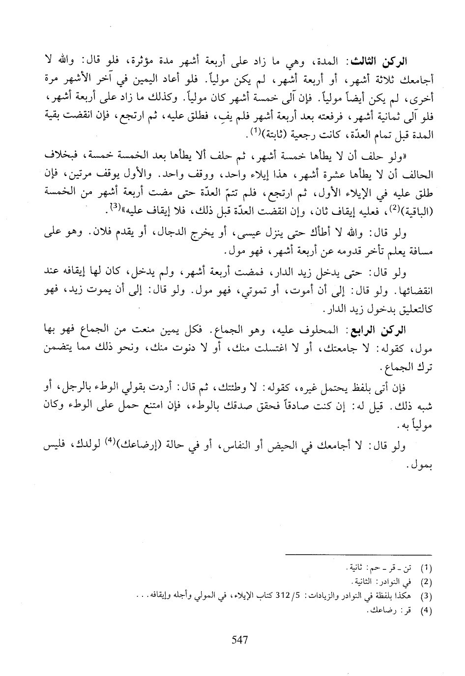 الركن الرابع: المحلوف عليه، وهو الجماع. فكل يمين منعت من الجماع فهو بها مول، كقوله: لا جامعتك، أو لا اغتسلت منك، أو لا دنوت منك، ونحو ذلك مما يتضمن ترك الجماع.