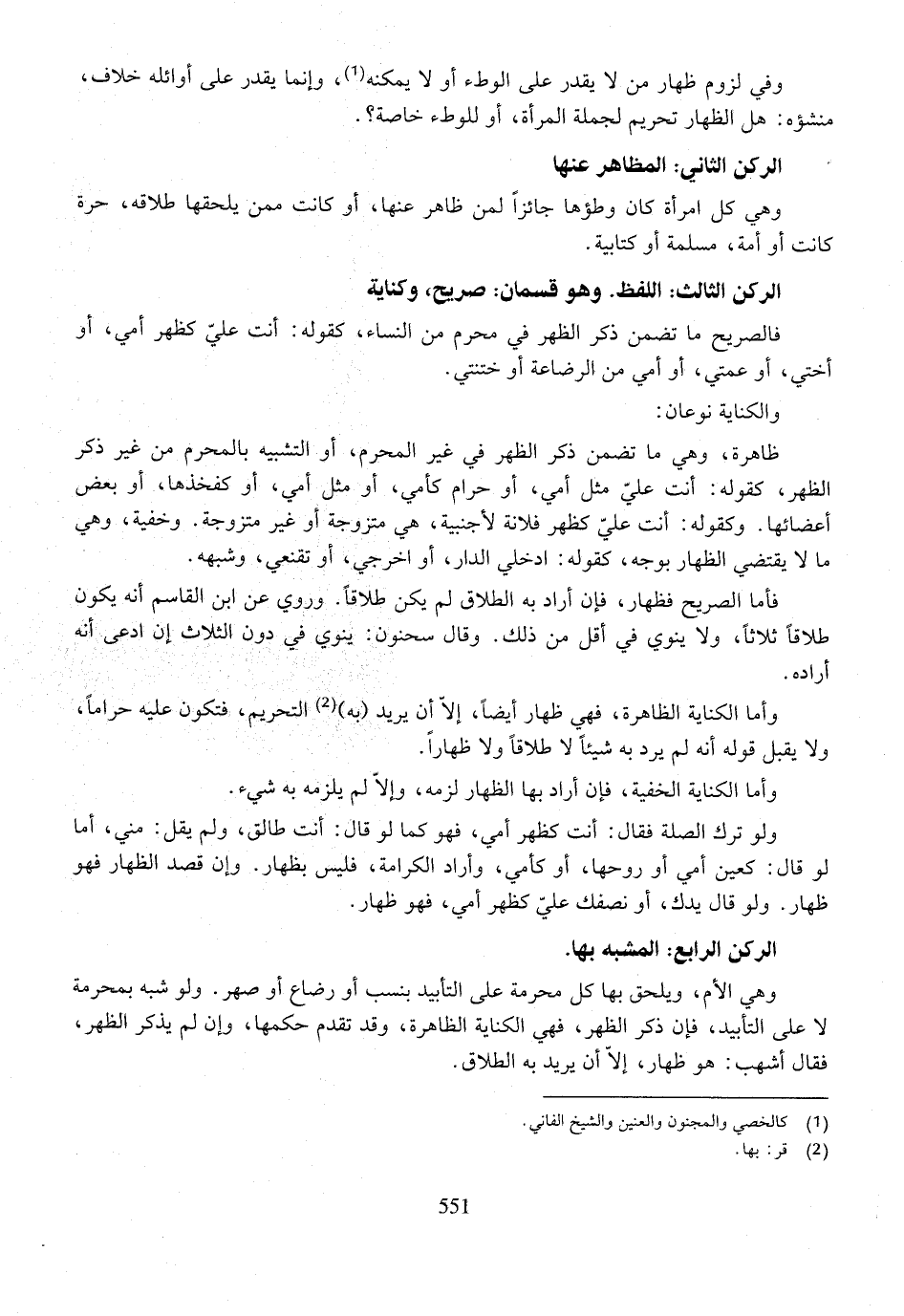 وهي الأم، ويلحق بها كل محرمة على التأبيد بنسب أو رضاع أو صهر. ولو شبه بمحرمة لا على التأبيد، فإن ذكر الظهر، فهي الكناية الظاهرة، وقد تقدم حكمها، وإن لم يذكر الظهر، فقال أشهب: هو ظهار، إلا أن يريد به الطلاق.