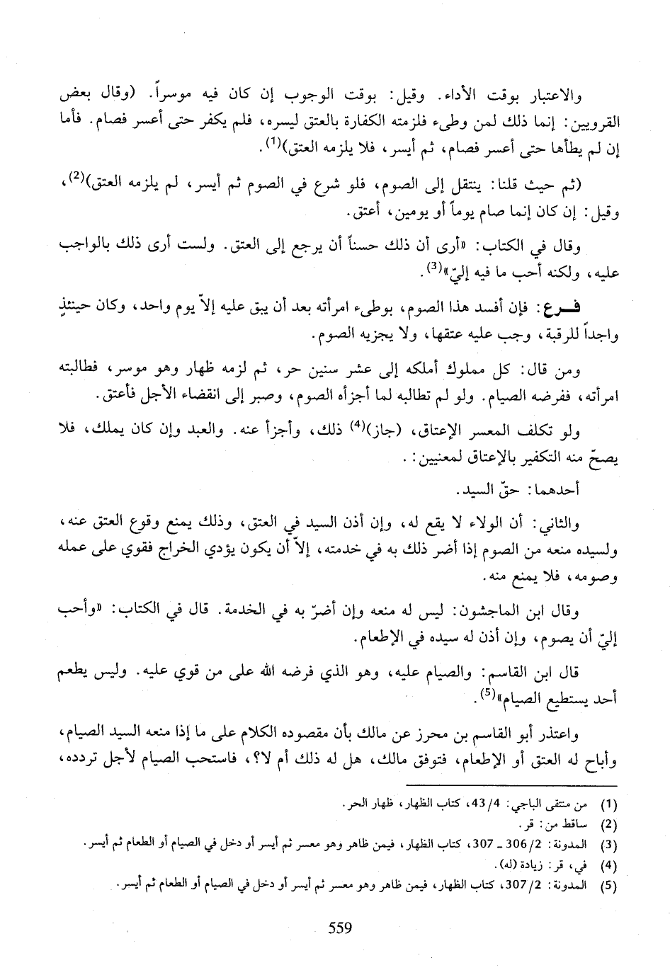 والاعتبار بوقت الأداء. وقيل: بوقت الوجوب إن كان فيه موسراً. (وقال بعض القرويين: إنما ذلك لمن وطئ فلزمته الكفارة بالعتق ليسره، فلم يكفر حتى أعسر فصام. فأما إن لم يطأها حتى أعسر فصام، ثم أيسر، فلا يلزمه العتق).