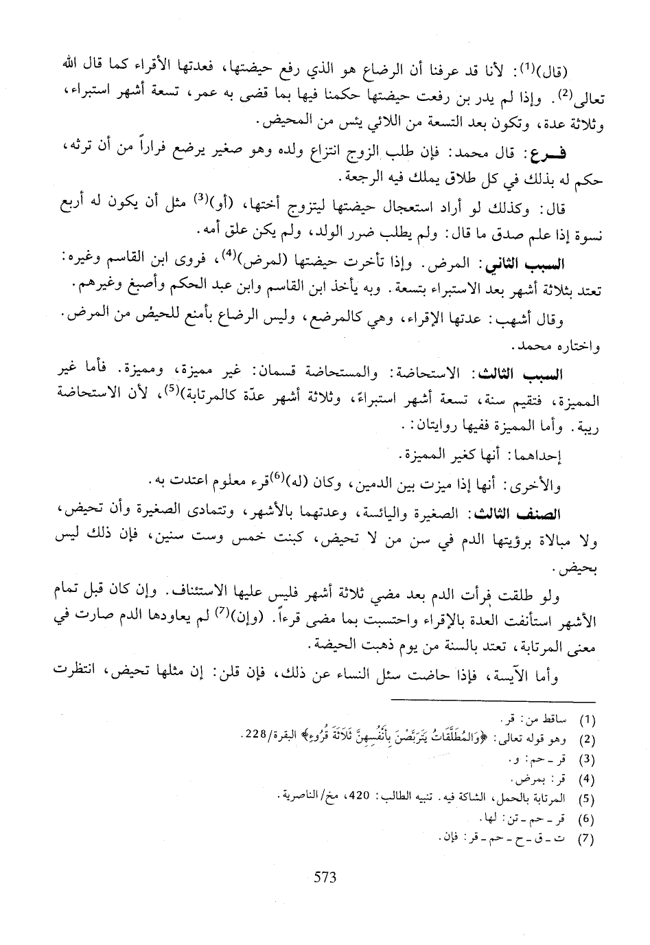 (قال): لأنا قد عرفنا أن الرضاه هو الذي رفع حيضتها، فعدتها الأقراء كما قال الله تعالى. وإذا لم يدر بن رفعت حيضتها حكمنا فيها بما قضى به عمر، تسعة أشهر استبراء، وثلاثة عدة، وتكون بعد التسعة من اللائي يئس من المحيض.