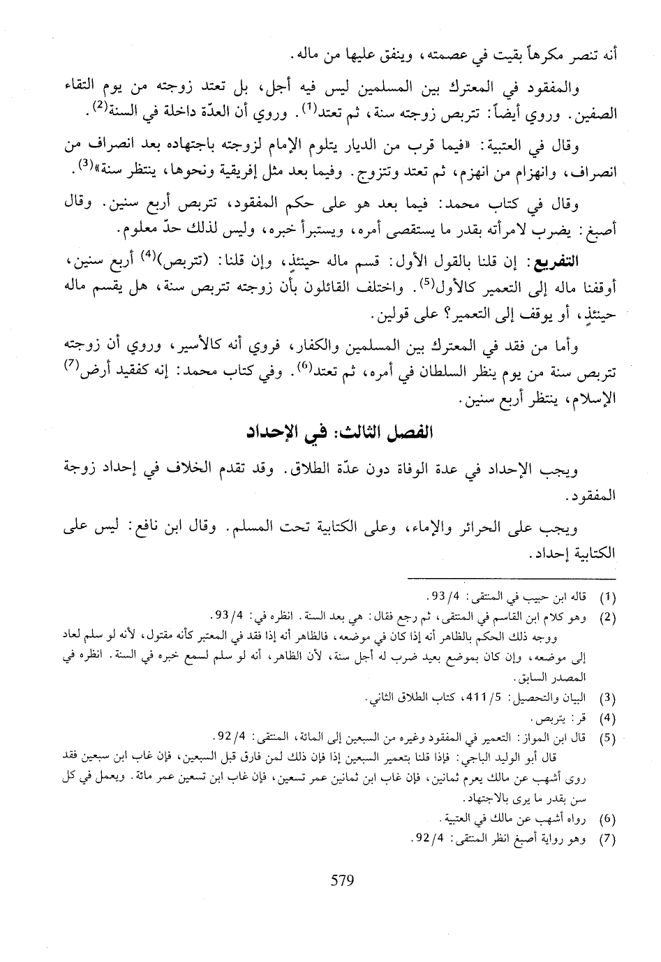 وقال في العتبية: ((فيما قرب من الديار يتلوم الإمام لزوجته باجتهاده بعد انصراف من انصراف، وانهزام من انهزام، ثم تعتد وتتزوج. وفيما بعد مثل إفريقية ونحوها، ينتظر سنة)).