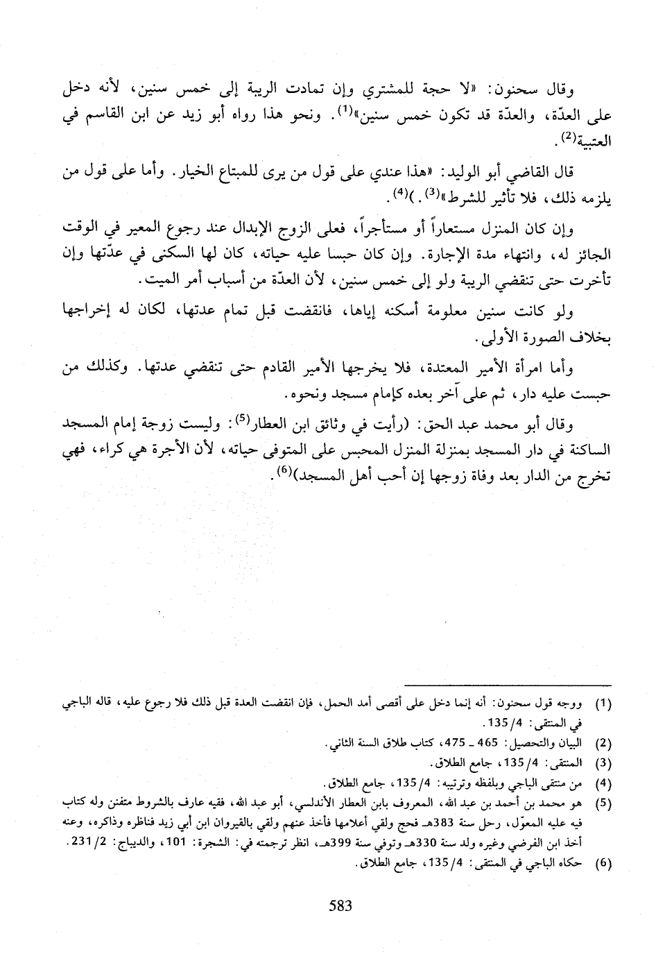 وقال أبو محمد عبد الحق: (رأيت في وثائق ابن العطار: وليست زوجة إمام المسجد الساكنة في دار المسجد بمنزلة المنزل المحبس على المتوفى حياته، لأن الأجرة هي كراء، فهي تخرج من الدار بعد وفاة زوجها إن أحب أهل المسجد).