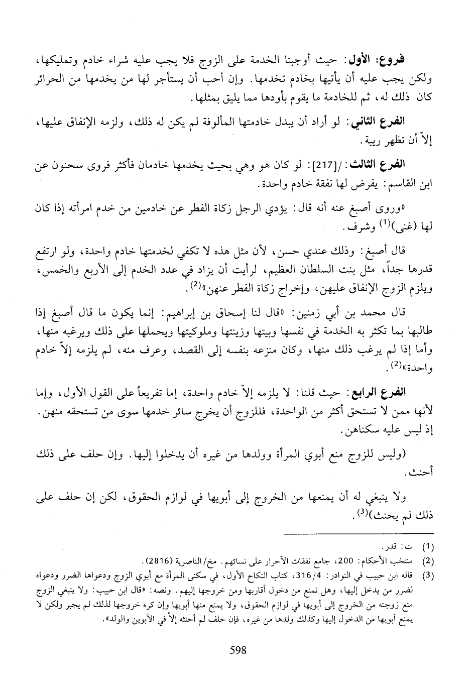 الفرع الثالث: لو كان هو وهي بحيث يخدمها خادمان فأكثر فروى سحنون عن ابن القاسم: يفرض لها نفقة خادم واحدة.