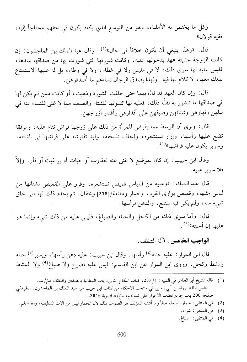 قال: ((وهذا ينبغي أن يكون خلافاً في حال)). وقال عبد الملك بن الماجشون: إن كانت الزوجة حديثة عهد بدخولها عليه، وكانت شورتها التي شورت بها من صداقها عندها، فليس عليه لها سوى ذلك، لا في ملبس ولا في غطاء، ولا في وطاء، بل له عليها الاستمتاع بذلك معها، لا كلام لها فيه. ولهذا يصدق الرجال نساءهم ما أصدقوهن.