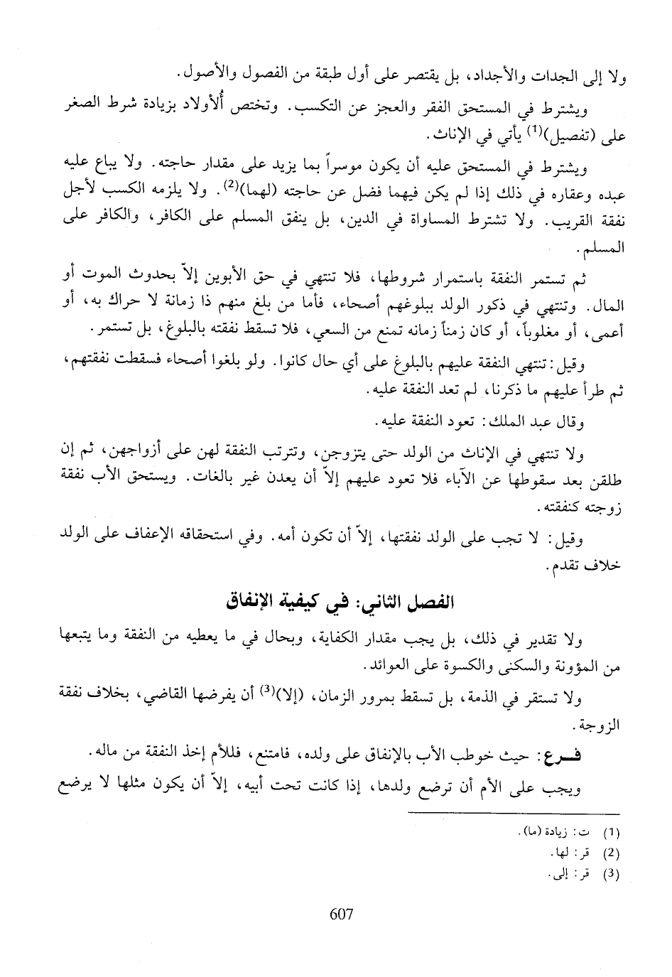 ولا تنتهي في الإناث من الولد حتى يتزوجن، وتترتب النفقة لهن على أزواجهن، ثم إن طلقن بعد سقوطها عن الآباء فلا تعود عليهم إلا أن يعدن غير بالغات. ويستحق الأب نفقة زوجته كنفقته.