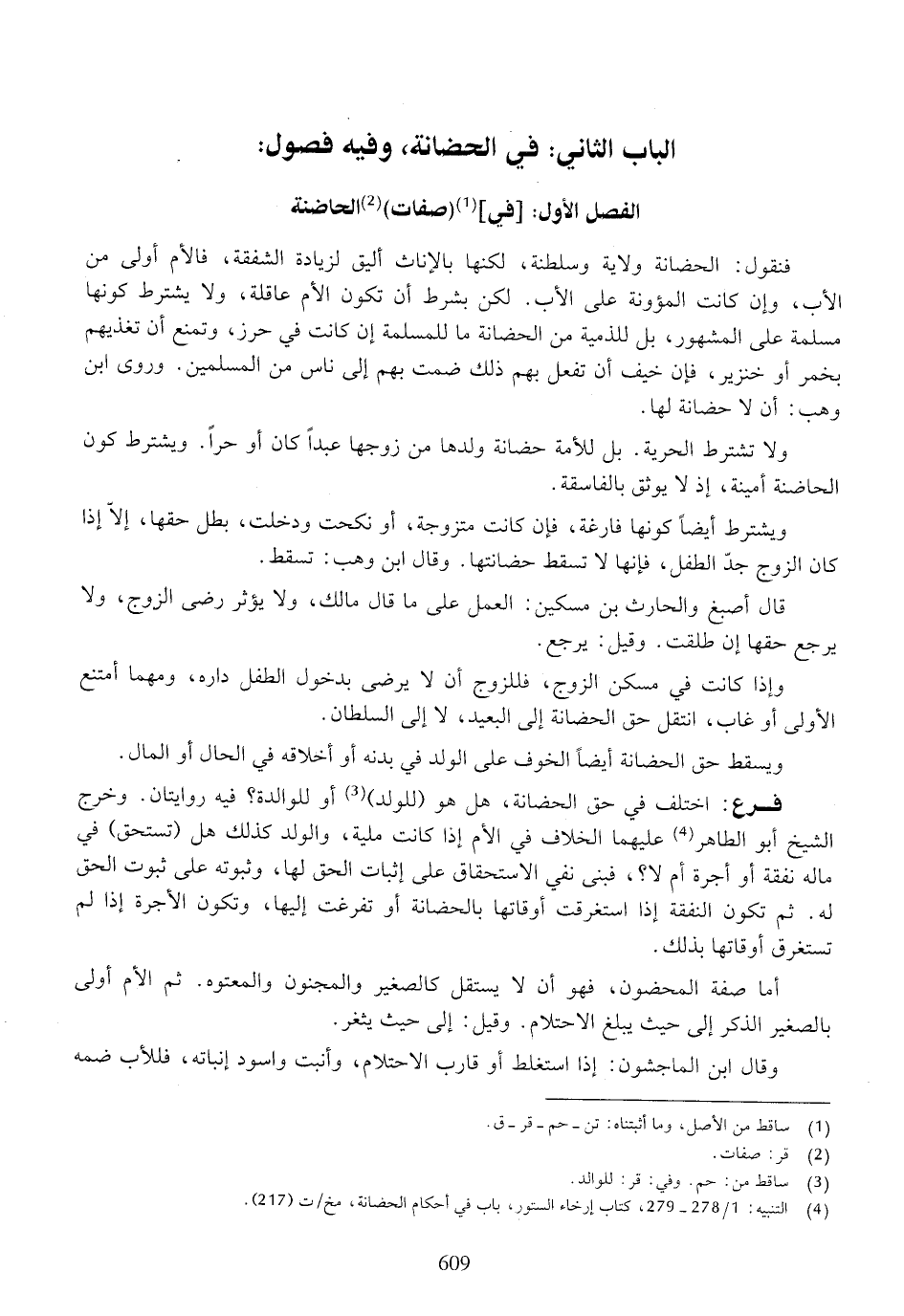 فنقول: الحضانة ولاية وسلطنة، لكنها بالإناث أليق لزيادة الشفقة، فالأم أولى من الأب، وإن كانت المؤونة على الأب. لكن بشرط أن تكون الأم عاقلة، ولا يشترط كونها مسلمة على المشهور، بل للذمية من الحضانة ما للمسلمة إن كانت في حرز، وتمنع أن تغذيهم بخمر أو خنزير، فإن خيف أن تفعل بهم ذلك ضمت بهم إلى ناس من المسلمين. وروى ابن وهب: أن لا حضانة لها.
