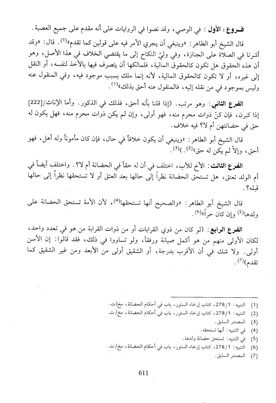 الفرع الرابع: (لو كان من ذوي القرابات أو من ذوات القرابة من هو في تعدد واحد، لكان الأولى منهم من هو أكمل صيانة ورفقاً، ولو تساووا في ذلك، فقد قالوا: إن الأسن أولى. ولا شك في أن الأقرب بدرجة، أو الشقيق أولى من الأبعد ومن غير الشقيق كما تقدم).
