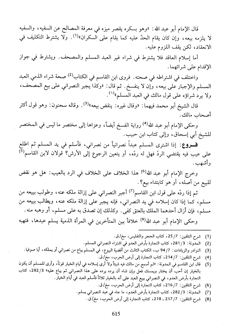 واختلف في اشتراطه في صحته. فروى ابن القاسم في الكتاب صحة شراء الذمي العبد المسلم والإجبار على بيعه، وإن لا ينفسخ. ثم قال: ((وكذا يجبر النصر على بيع المصحف، ولا يرد شراؤه على قول مالك في العبد المسلم)).
