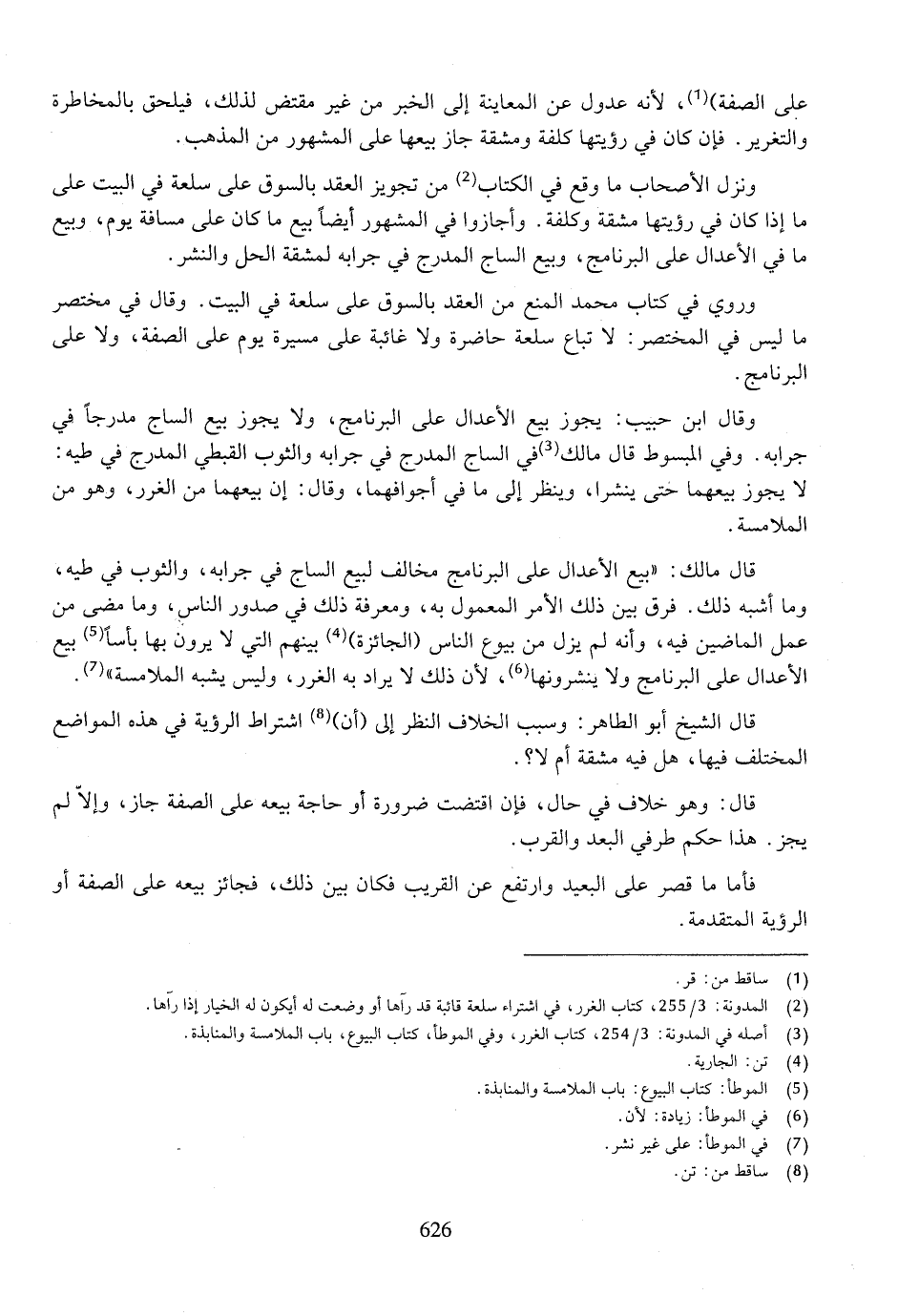 وقال ابن حبيب: يجوز بيع الأعدال على البرنامج، ولا يجوز بيع الساج مدرجاً في جرابه. وفي المبسوط قال مالك في الساج المدرج في جرابه والثوب القبطي المدرج في طيه: لا يجوز بيعهما حتى ينشرا، وينظر إلى ما في أجوافهما، وقال: إن بيعهما من الغرر، وهو من الملامسة.