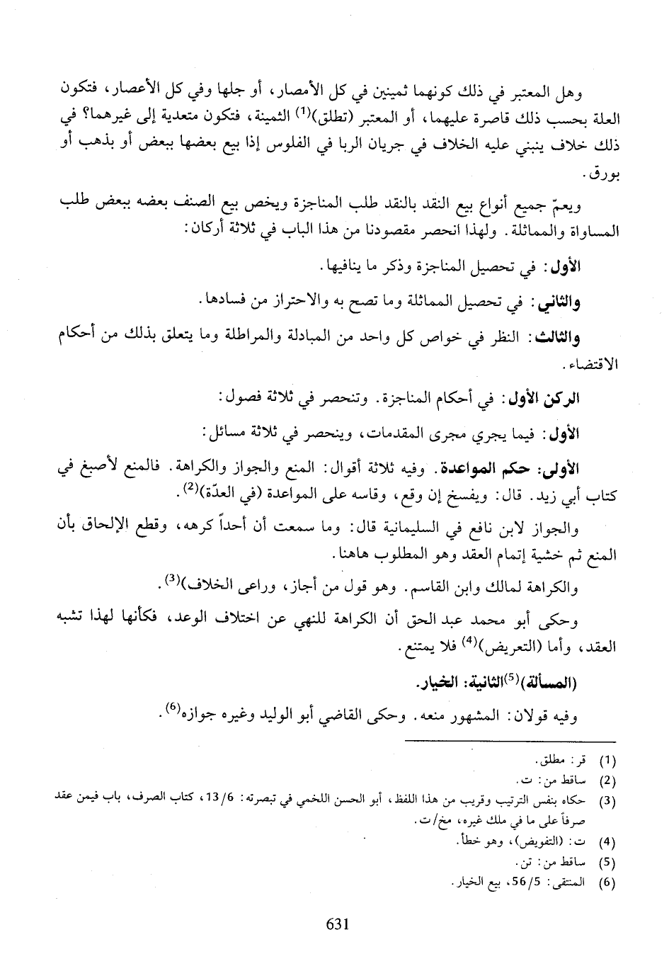 ويعم جميع أنواع بيع النقد بالنقد طلب المناجزة ويخص بيع الصنف بعضه ببعض طلب المساواة والمماثلة. ولهذا انحصر مقصودنا من هذا الباب في ثلاثة أركان: