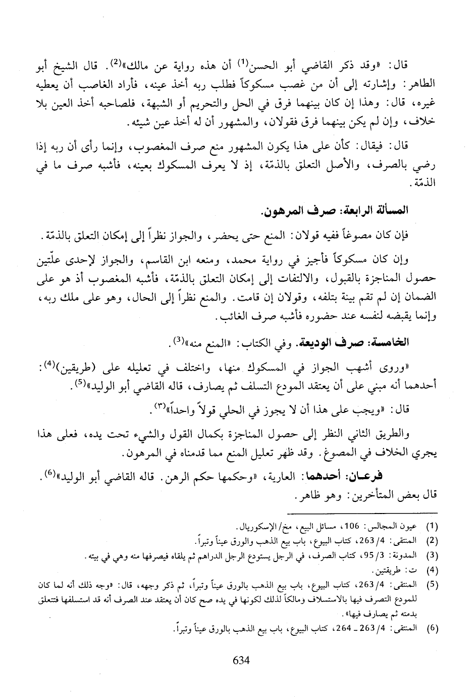 قال: ((وقد ذكر القاضي أبو الحسن أن هذه رواية عن مالك)). قال الشيخ أبو الطاهر: وإشارته إلى أن من غصب مسكوكاً فطلب ربه أخذ عينه، فأراد الغاصب أن يعطيه غيره، قال: وهذا إن كان بينهما فرق في الحل والتحريم أو الشبهة، فلصاحبه أخذ العين بلا خلاف، وإن لم يكن بينهما فرق فقولان، والمشهور أن له أخذ عين شيئه.