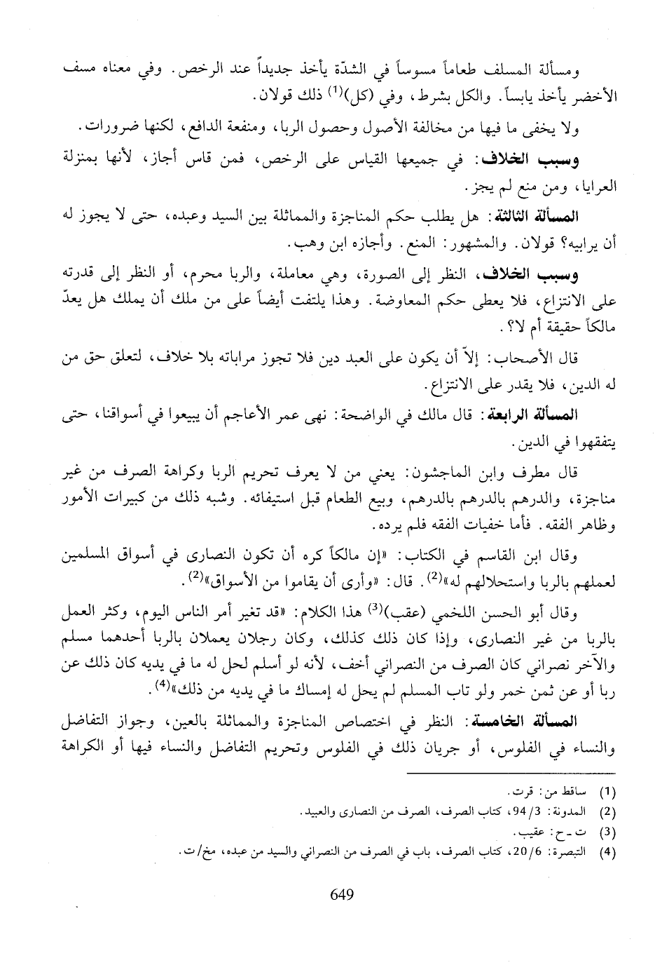 وقال أبو الحسن اللخمي (عقب) هذا الكلام: ((قد تغير أمر الناس اليوم، وكثر العمل بالربا من غير النصارى، وإذا كان ذلك كذلك، وكان رجلان يعملان بالربا أحدهما مسلم والآخر نصراني كان الصرف من النصراني أخف، لأنه لو أسلم لحل له ما في يديه كان ذلك عن ربا أو عن ثمن خمر ولو تاب المسلم لم يحل له إمساك ما في يديه من ذلك)).
