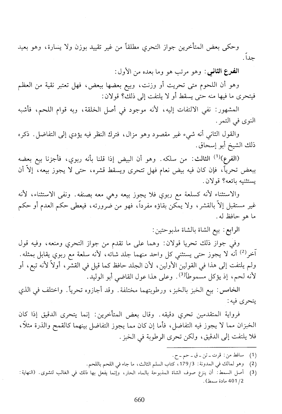 وهو أن اللحوم متى تحريت أو وزنت، وبيع بعضها ببعض، فهل تعتبر نقية من العظم فيتحرى ما فيها منه حتى يسقط أو لا يلتفت إلى ذلك؟ قولان: