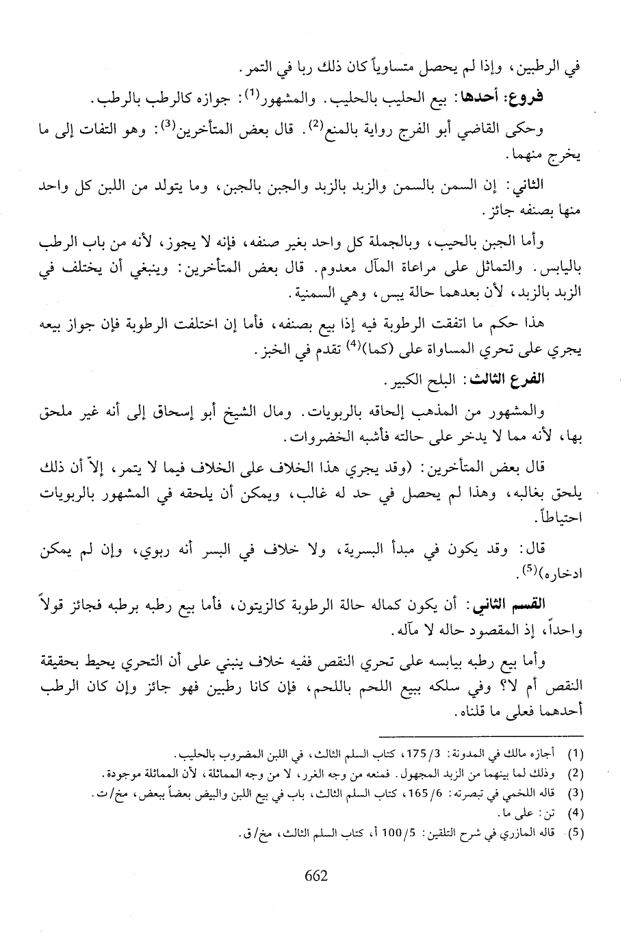 وأما الجبن بالحليب، وبالجملة كل واحد بغير صنفه، فإنه لا يجوز، لأنه من باب الرطب باليابس. والتماثل على مراعاة المآل معدوم. قال بعض المتأخرين: وينبغي أن يختلف في الزبد بالزبد، لأن بعدهما حالة يبس، وهي السمنية.