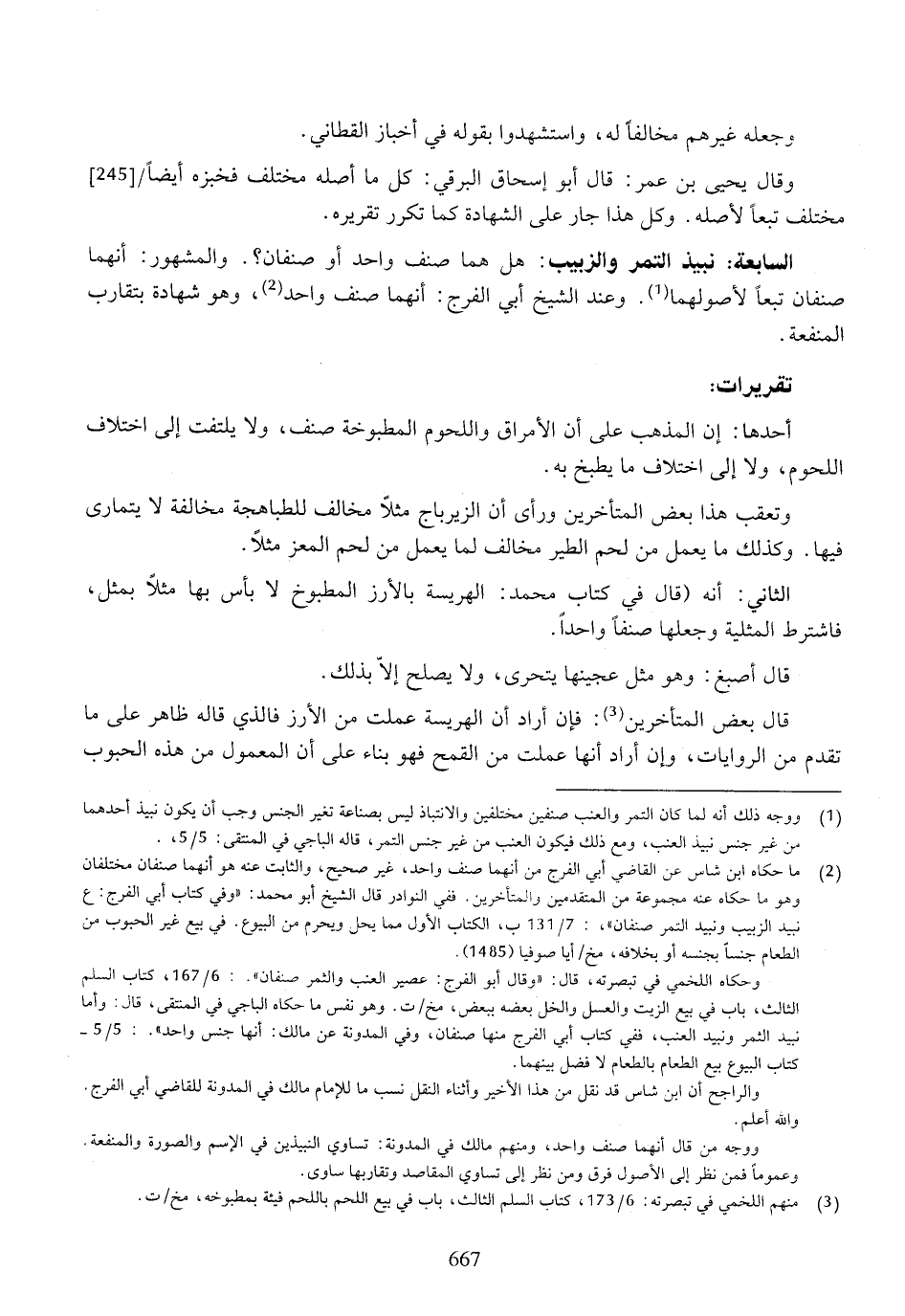 السابعة: نبيذ التمر والزبيب: هل هما صنف واحد أو صنفان؟. والمشهور: أنهما صنفان تبعاً لأصولهما. وعند الشيخ أبي الفرج: أنهما صنف واحد، وهو شهادة بتقارب المنفعة.